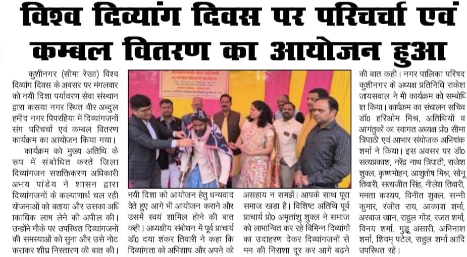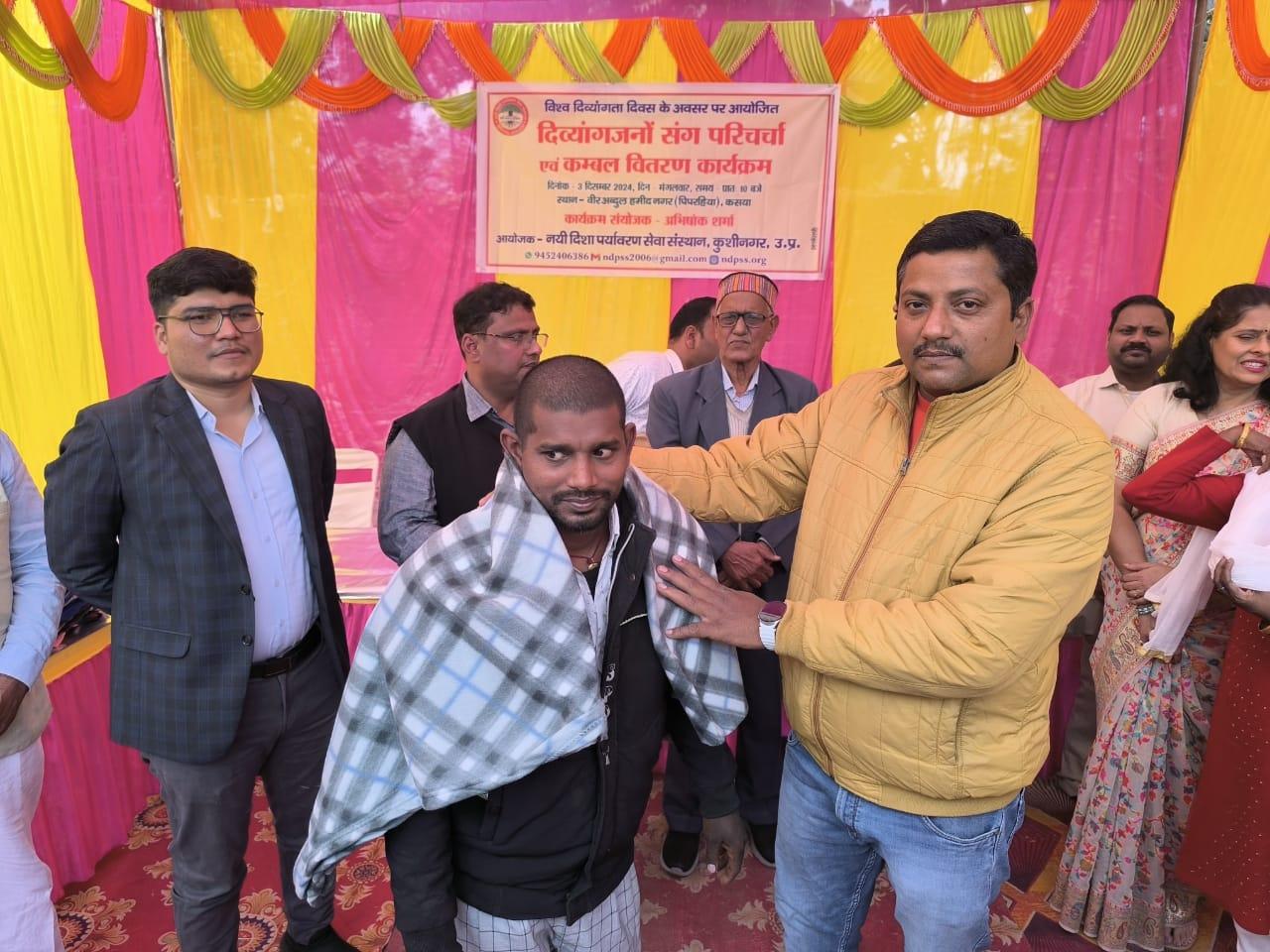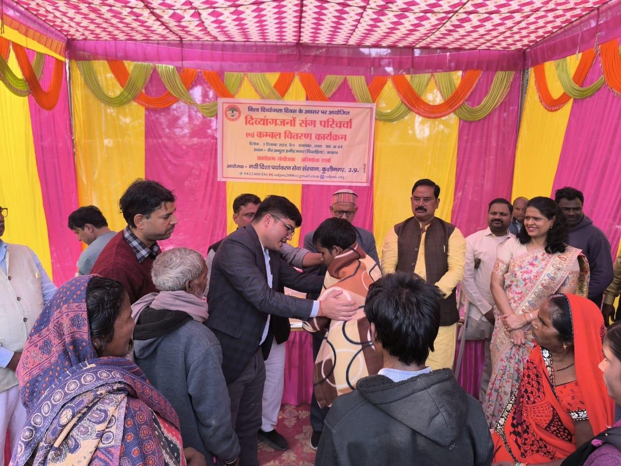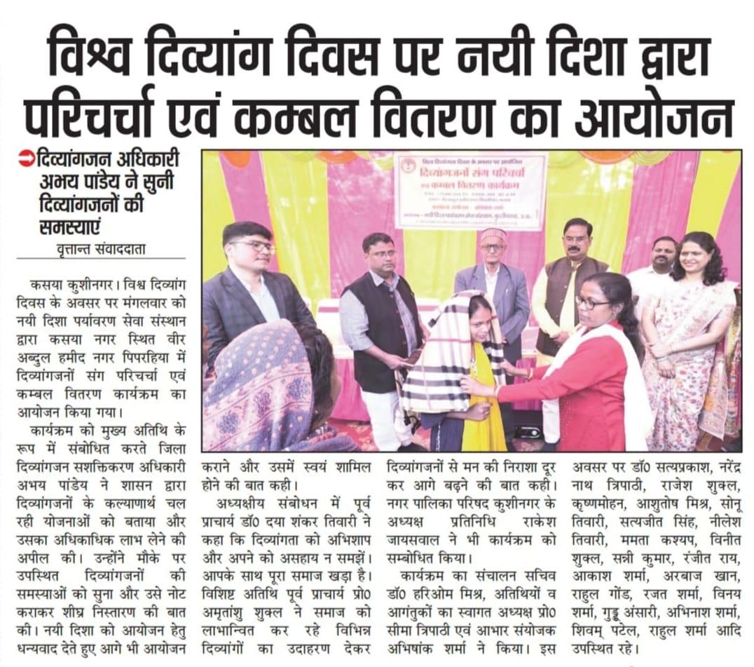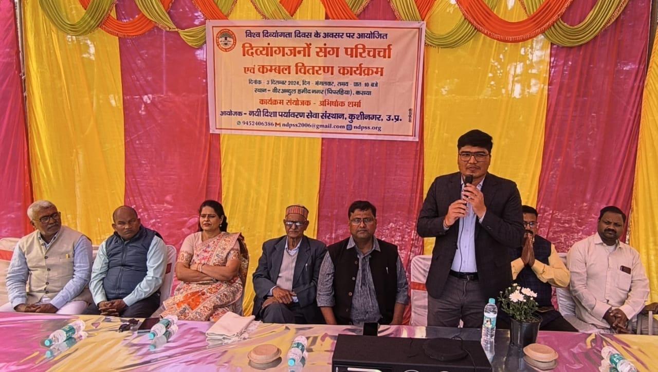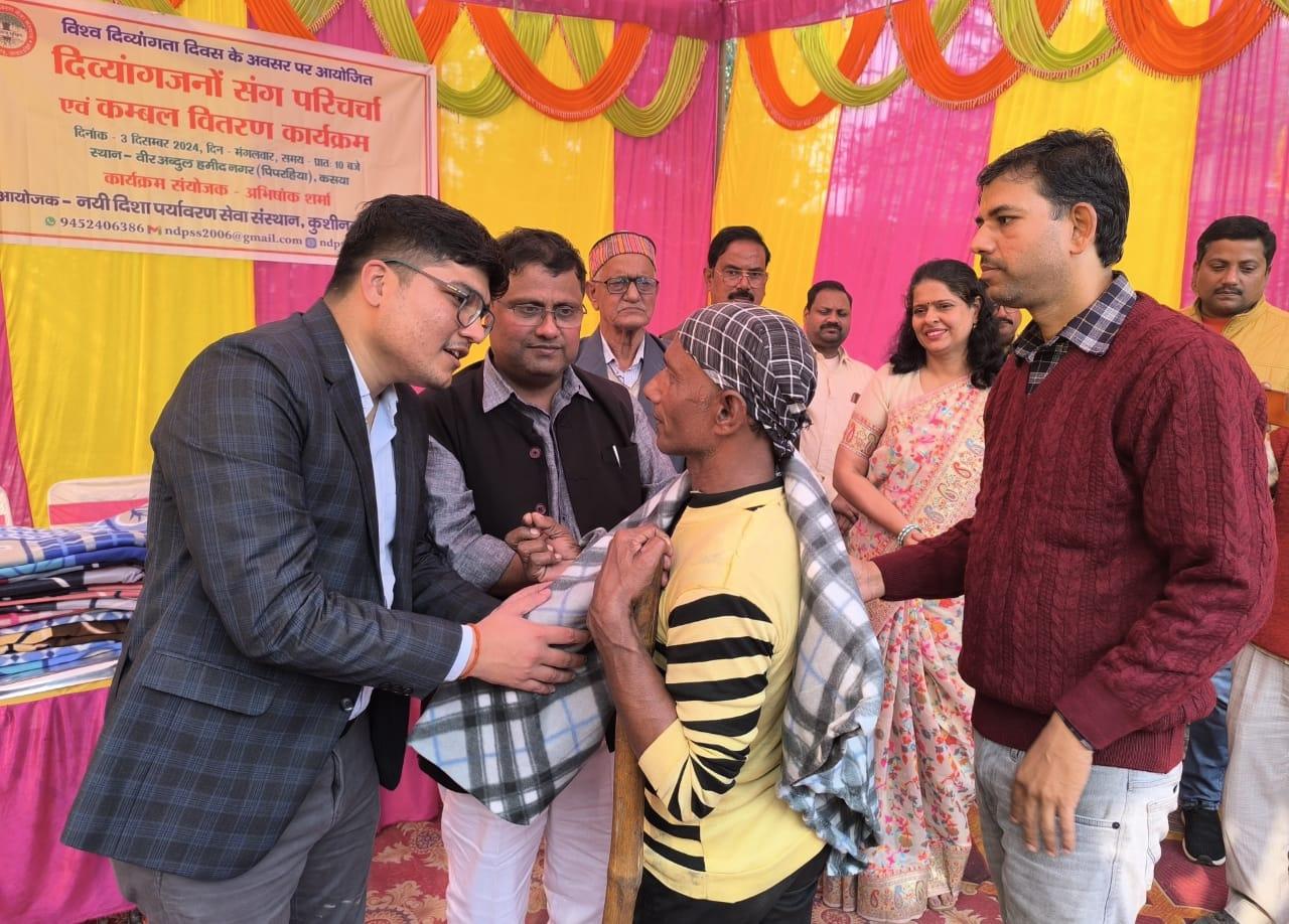 विश्व दिव्यांग दिवस के अवसर पर संस्थान द्वारा कसया नगर स्थित वीर अब्दुल हमीद नगर पिपरहिया में दिव्यांगजनों संग परिचर्चा एवं कम्बल वितरण कार्यक्रम का आयोजन किया गया। कार्यक्रम में अतिथि के रूप में उपस्थित जिला दिव्यांगजन सशक्तिकरण अधिकारी श्री अभय पांडेय ने शासन द्वारा दिव्यांगजनों के कल्याणार्थ चल रही योजनाओं को बताया और उसका अधिकाधिक लाभ लेने की अपील की। उन्होंने मौके पर उपस्थित दिव्यांगजनों की समस्याओं को सुना और उसे नोट कराकर शीघ्र निस्तारण की बात कही।