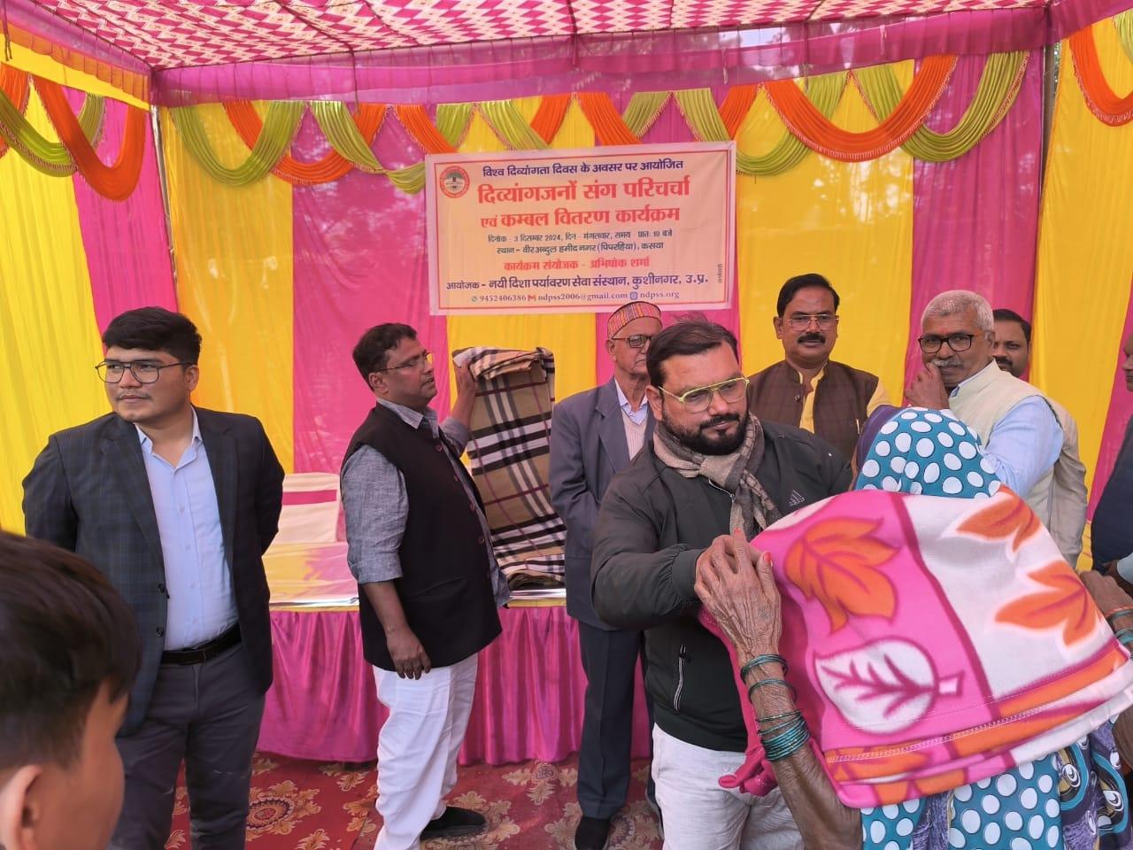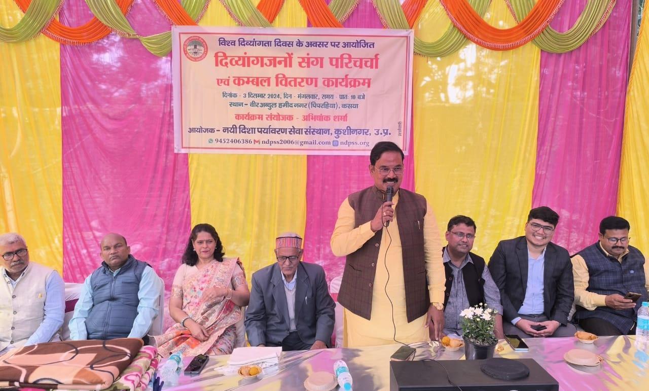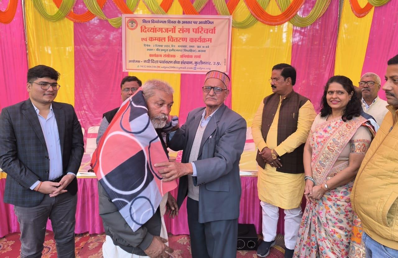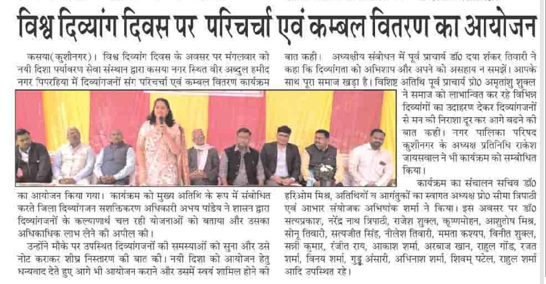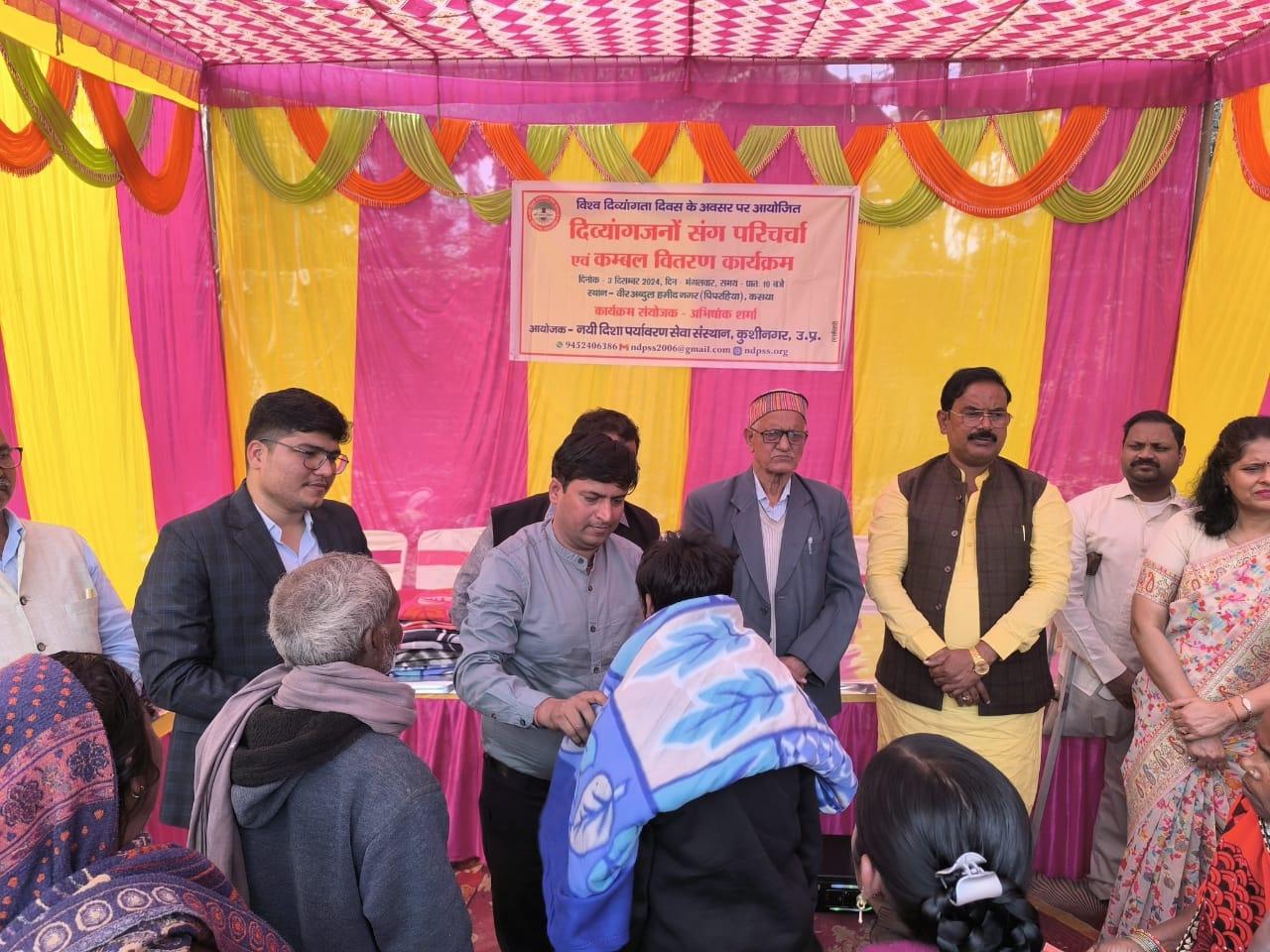 विश्व दिव्यांग दिवस के अवसर पर संस्थान द्वारा कसया नगर स्थित वीर अब्दुल हमीद नगर पिपरहिया में दिव्यांगजनों संग परिचर्चा एवं कम्बल वितरण कार्यक्रम का आयोजन किया गया। कार्यक्रम में अतिथि के रूप में उपस्थित जिला दिव्यांगजन सशक्तिकरण अधिकारी श्री अभय पांडेय ने शासन द्वारा दिव्यांगजनों के कल्याणार्थ चल रही योजनाओं को बताया और उसका अधिकाधिक लाभ लेने की अपील की। उन्होंने मौके पर उपस्थित दिव्यांगजनों की समस्याओं को सुना और उसे नोट कराकर शीघ्र निस्तारण की बात कही।