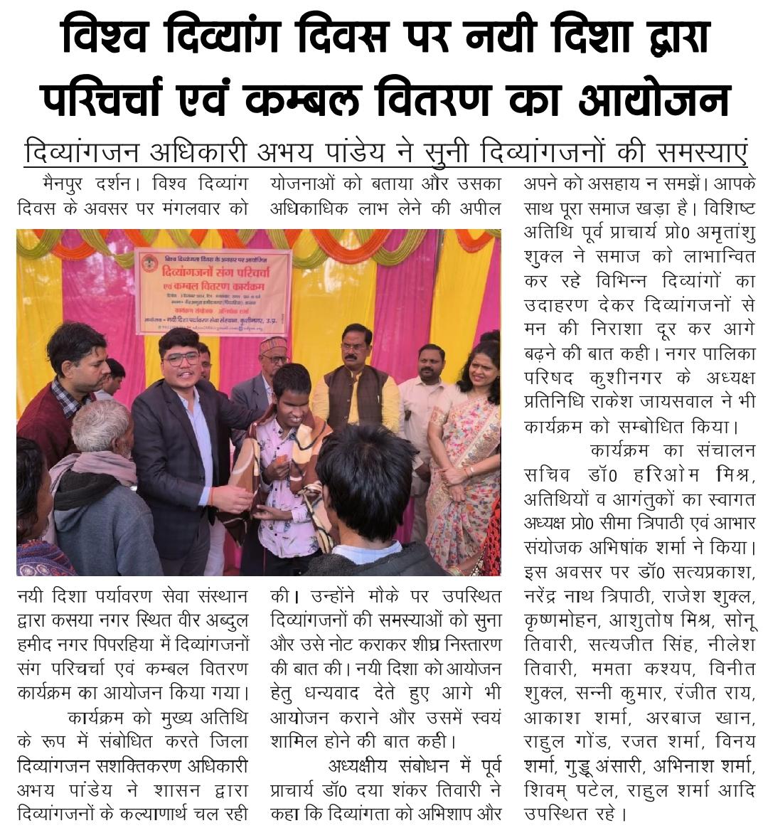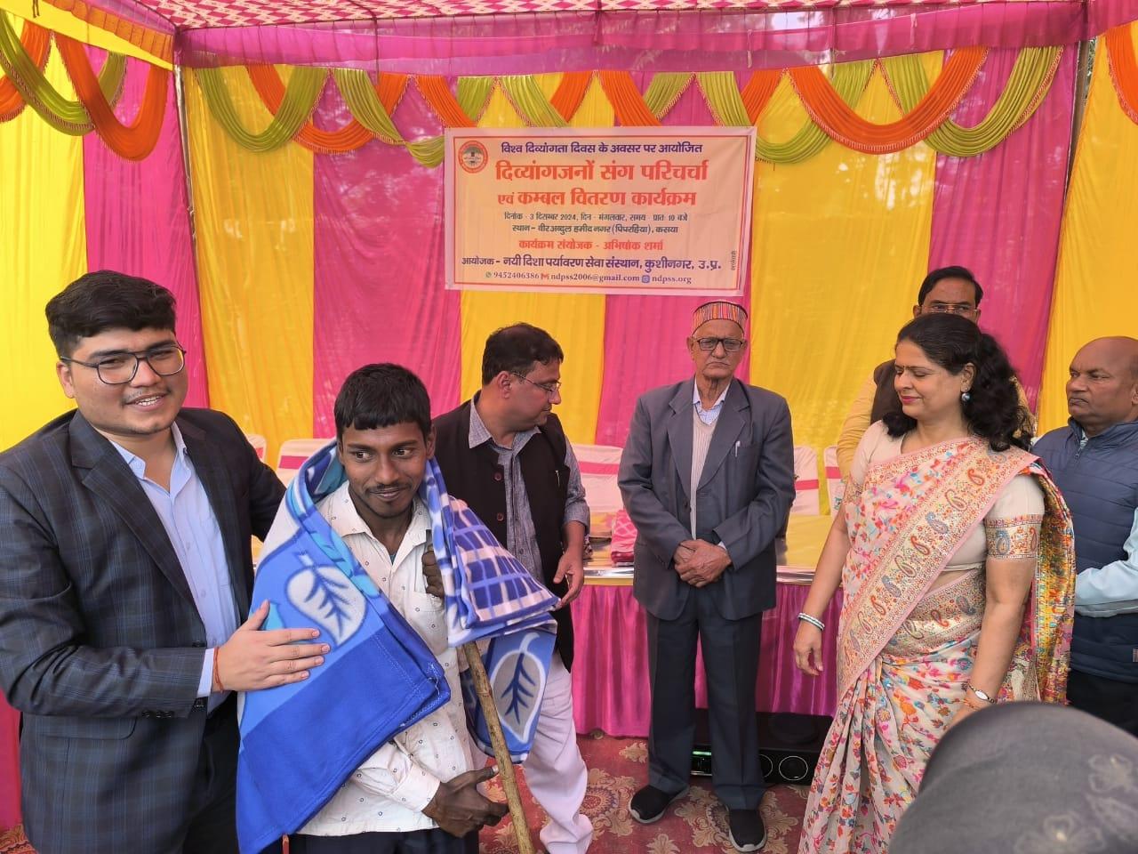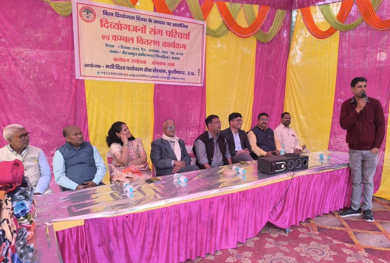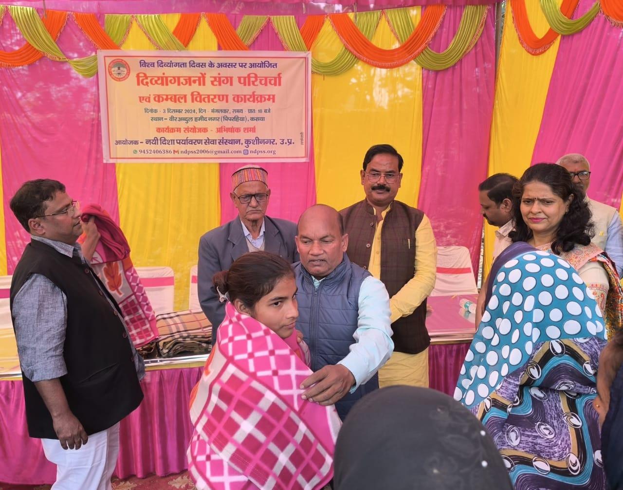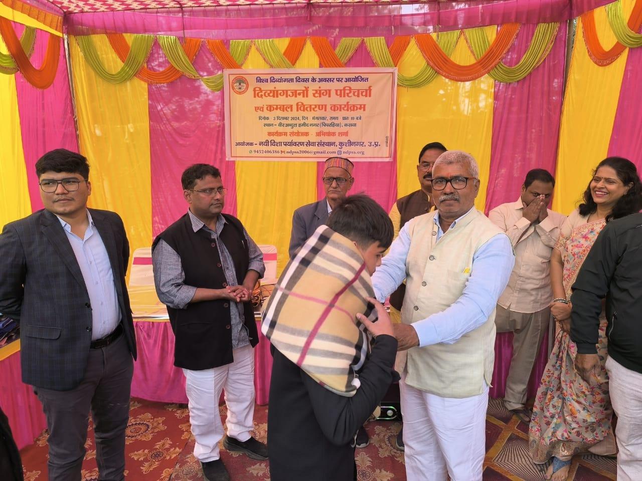 विश्व दिव्यांग दिवस के अवसर पर संस्थान द्वारा कसया नगर स्थित वीर अब्दुल हमीद नगर पिपरहिया में दिव्यांगजनों संग परिचर्चा एवं कम्बल वितरण कार्यक्रम का आयोजन किया गया। कार्यक्रम में अतिथि के रूप में उपस्थित जिला दिव्यांगजन सशक्तिकरण अधिकारी श्री अभय पांडेय ने शासन द्वारा दिव्यांगजनों के कल्याणार्थ चल रही योजनाओं को बताया और उसका अधिकाधिक लाभ लेने की अपील की। उन्होंने मौके पर उपस्थित दिव्यांगजनों की समस्याओं को सुना और उसे नोट कराकर शीघ्र निस्तारण की बात कही।