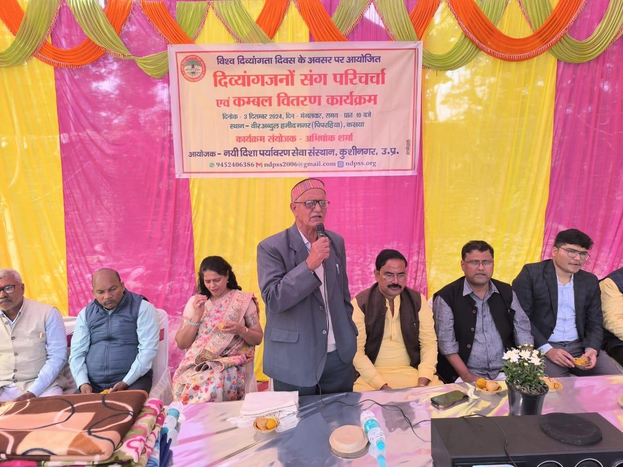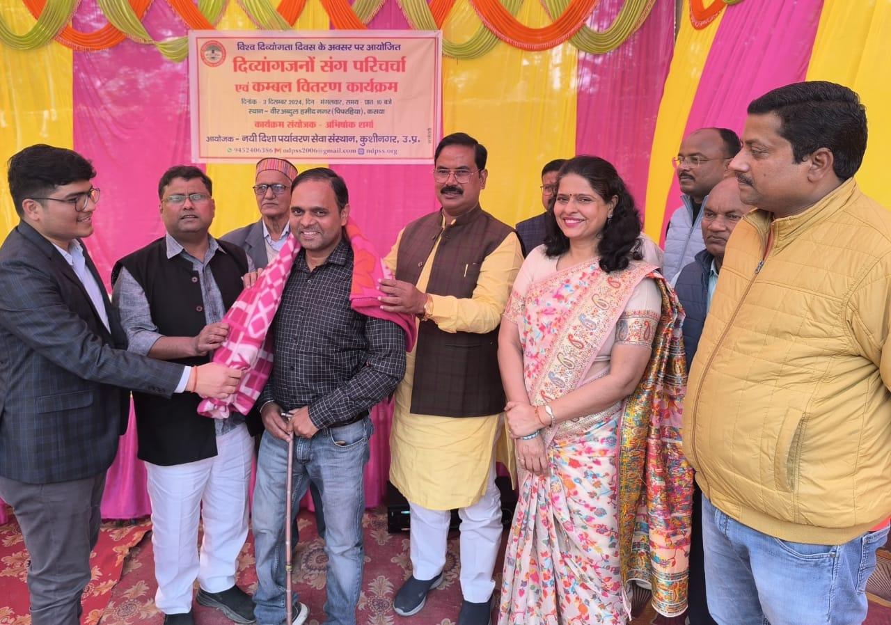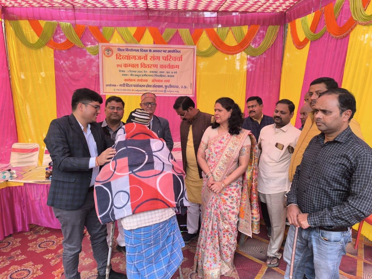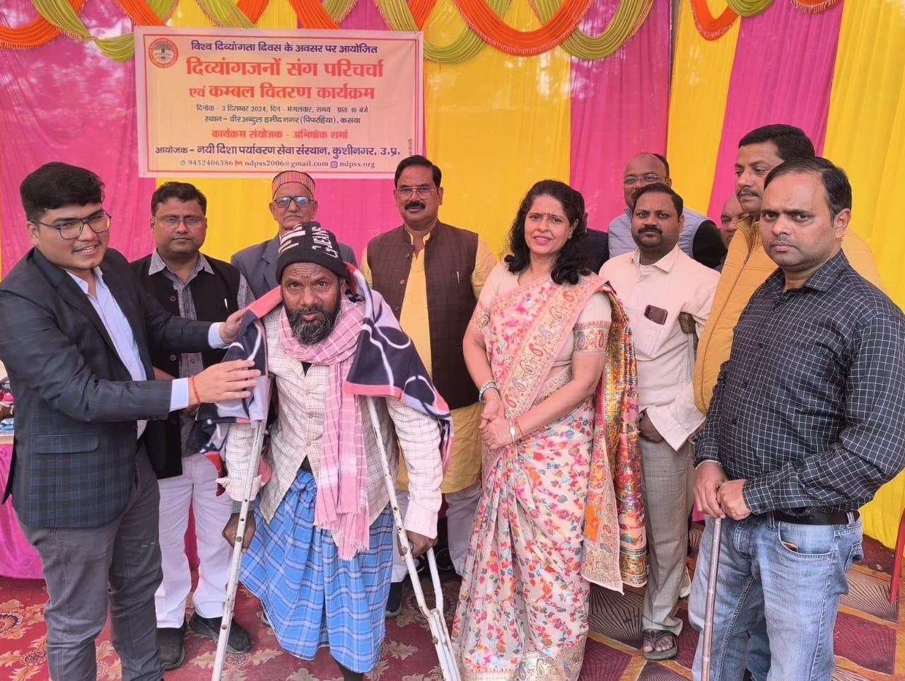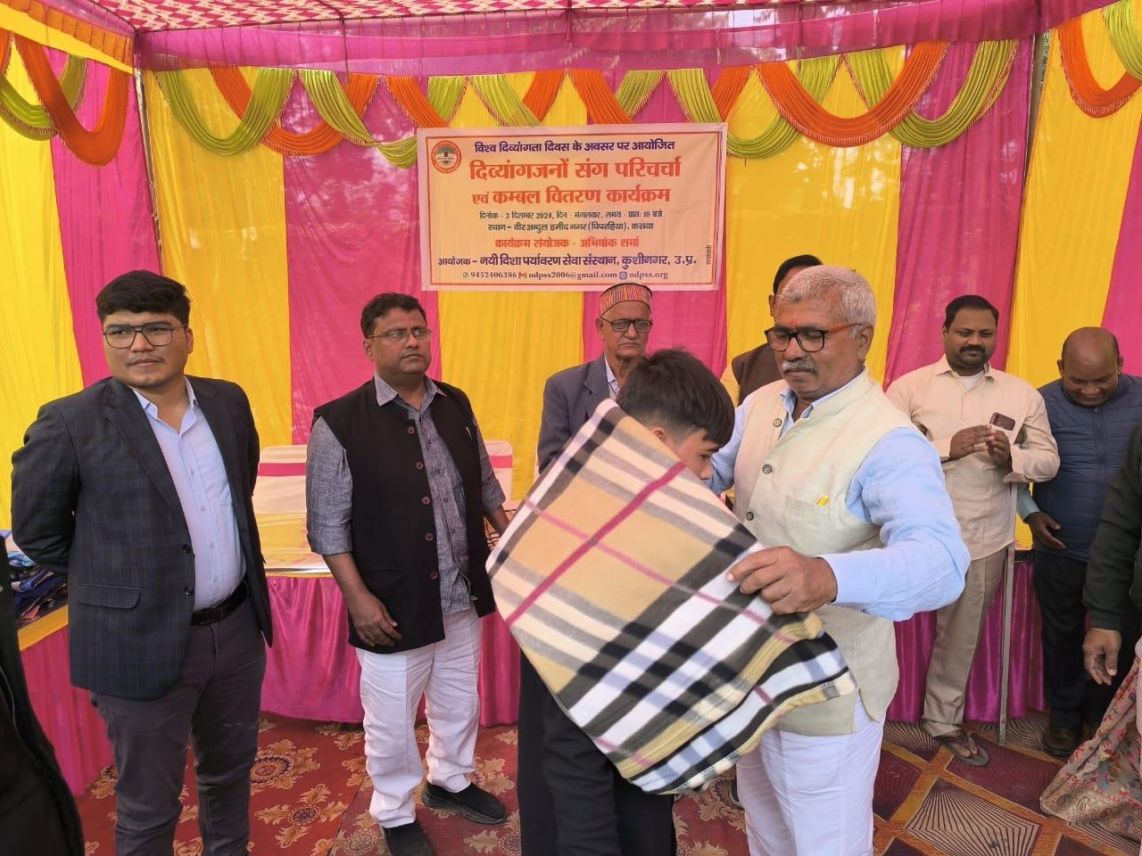 विश्व दिव्यांग दिवस के अवसर पर संस्थान द्वारा कसया नगर स्थित वीर अब्दुल हमीद नगर पिपरहिया में दिव्यांगजनों संग परिचर्चा एवं कम्बल वितरण कार्यक्रम का आयोजन किया गया। कार्यक्रम में अतिथि के रूप में उपस्थित जिला दिव्यांगजन सशक्तिकरण अधिकारी श्री अभय पांडेय ने शासन द्वारा दिव्यांगजनों के कल्याणार्थ चल रही योजनाओं को बताया और उसका अधिकाधिक लाभ लेने की अपील की। उन्होंने मौके पर उपस्थित दिव्यांगजनों की समस्याओं को सुना और उसे नोट कराकर शीघ्र निस्तारण की बात कही।