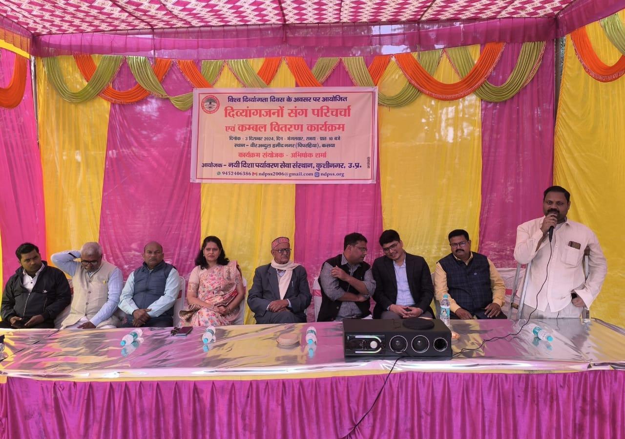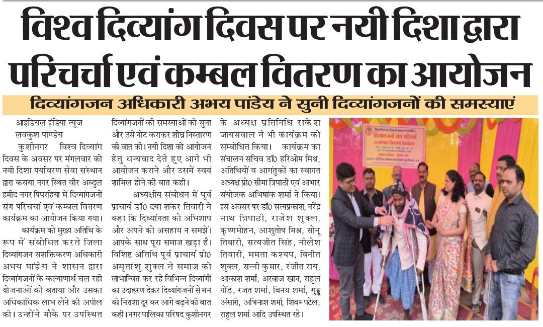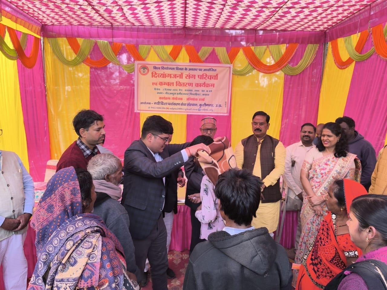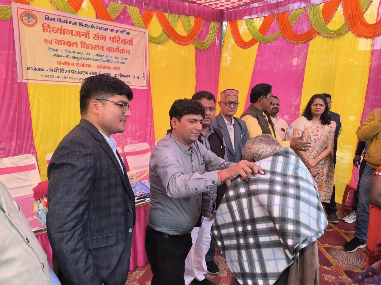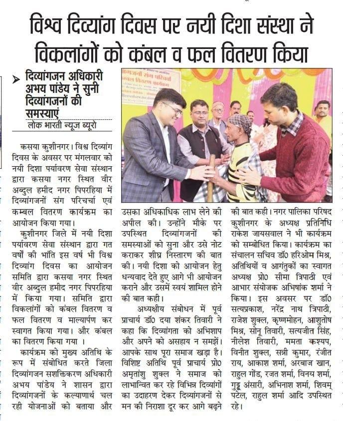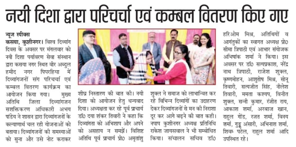 विश्व दिव्यांग दिवस के अवसर पर संस्थान द्वारा कसया नगर स्थित वीर अब्दुल हमीद नगर पिपरहिया में दिव्यांगजनों संग परिचर्चा एवं कम्बल वितरण कार्यक्रम का आयोजन किया गया। कार्यक्रम में अतिथि के रूप में उपस्थित जिला दिव्यांगजन सशक्तिकरण अधिकारी श्री अभय पांडेय ने शासन द्वारा दिव्यांगजनों के कल्याणार्थ चल रही योजनाओं को बताया और उसका अधिकाधिक लाभ लेने की अपील की। उन्होंने मौके पर उपस्थित दिव्यांगजनों की समस्याओं को सुना और उसे नोट कराकर शीघ्र निस्तारण की बात कही।