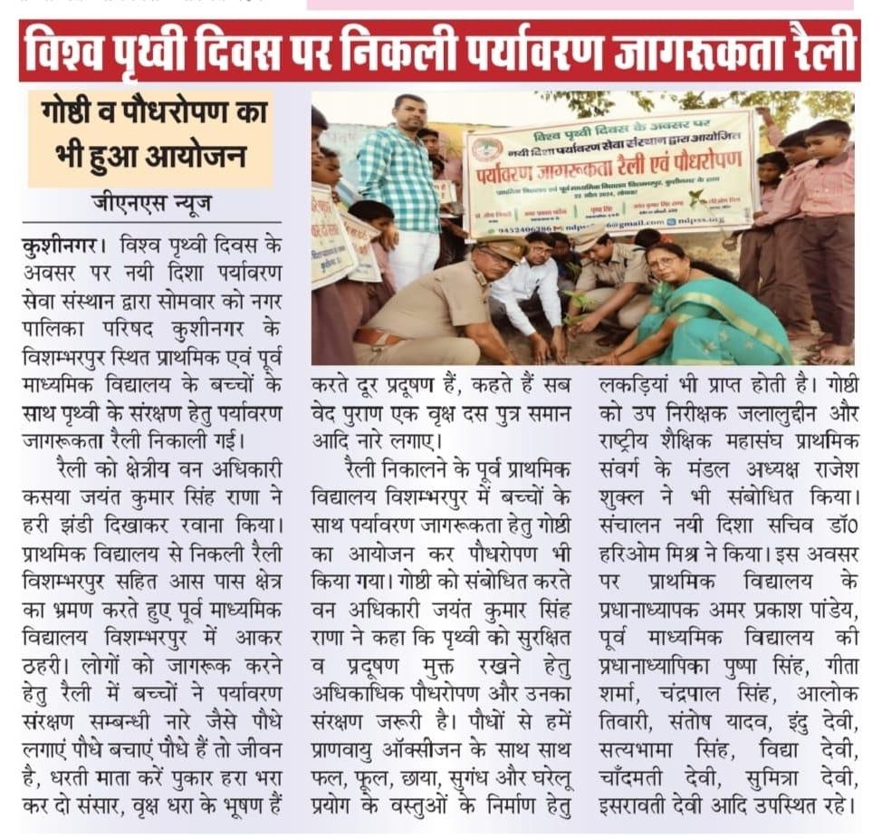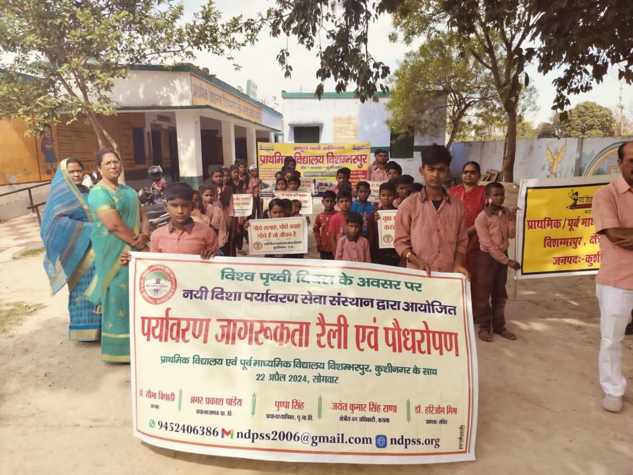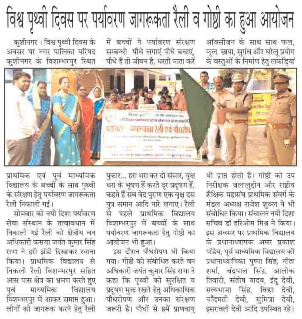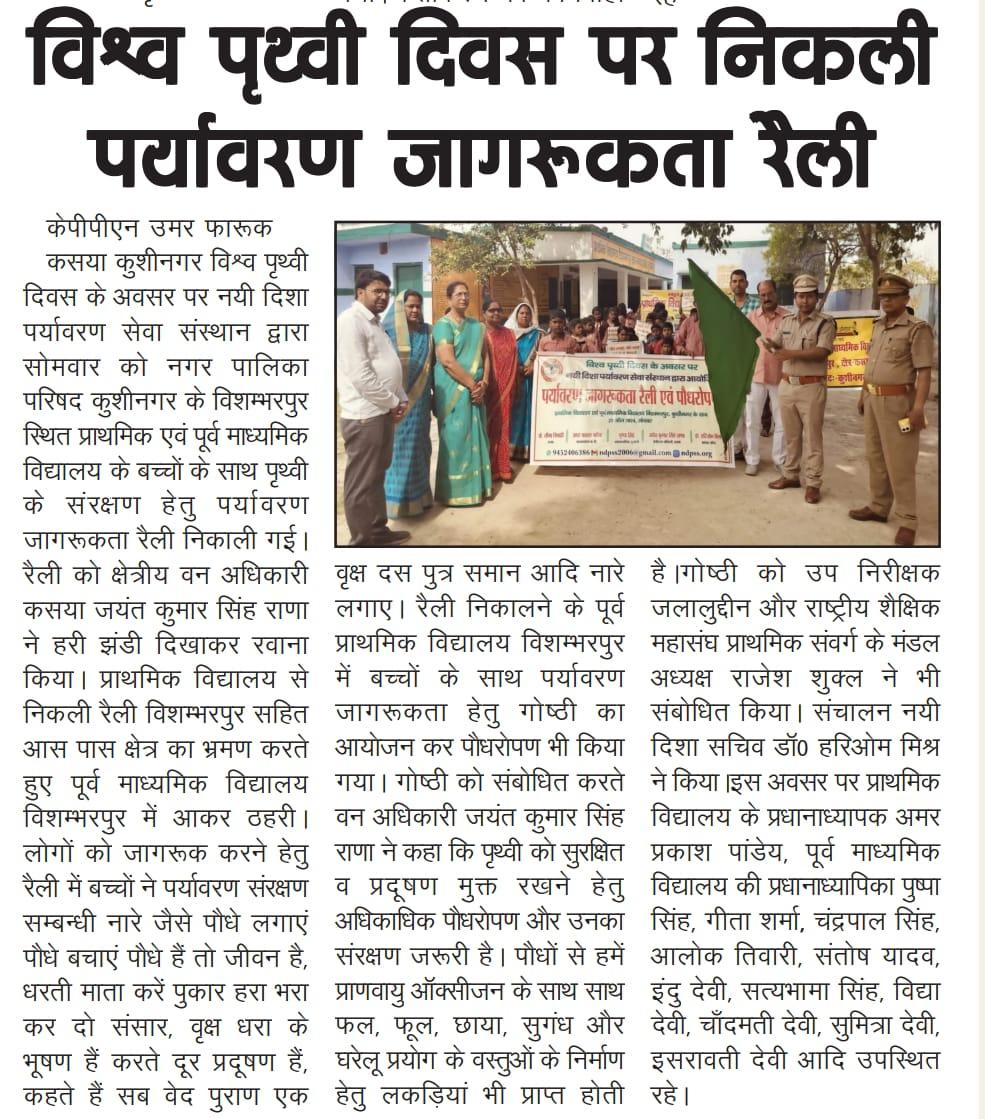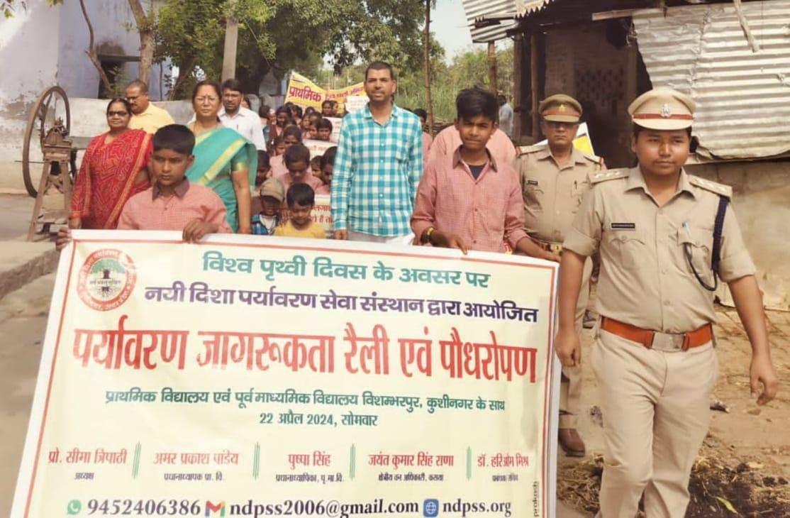 विश्व पृथ्वी दिवस के अवसर पर संस्थान द्वारा नगर पालिका परिषद कुशीनगर के विशम्भरपुर स्थित प्राथमिक एवं पूर्व माध्यमिक विद्यालय के बच्चों के साथ पृथ्वी के संरक्षण हेतु पर्यावरण जागरूकता रैली निकाली गई। रैली को क्षेत्रीय वन अधिकारी कसया श्री जयंत कुमार सिंह राणा ने हरी झंडी दिखाकर रवाना किया। प्राथमिक विद्यालय से निकली रैली विशम्भरपुर सहित आस पास क्षेत्र का भ्रमण करते हुए पूर्व माध्यमिक विद्यालय विशम्भरपुर में आकर ठहरी। लोगों को जागरूक करने हेतु रैली में बच्चों ने पर्यावरण संरक्षण सम्बन्धी नारे जैसे पौधे लगाएं पौधे बचाएं पौधे हैं तो जीवन है, धरती माता करें पुकार हरा भरा कर दो संसार, वृक्ष धरा के भूषण हैं करते दूर प्रदूषण हैं, कहते हैं सब वेद पुराण एक वृक्ष दस पुत्र समान आदि नारे लगाए।