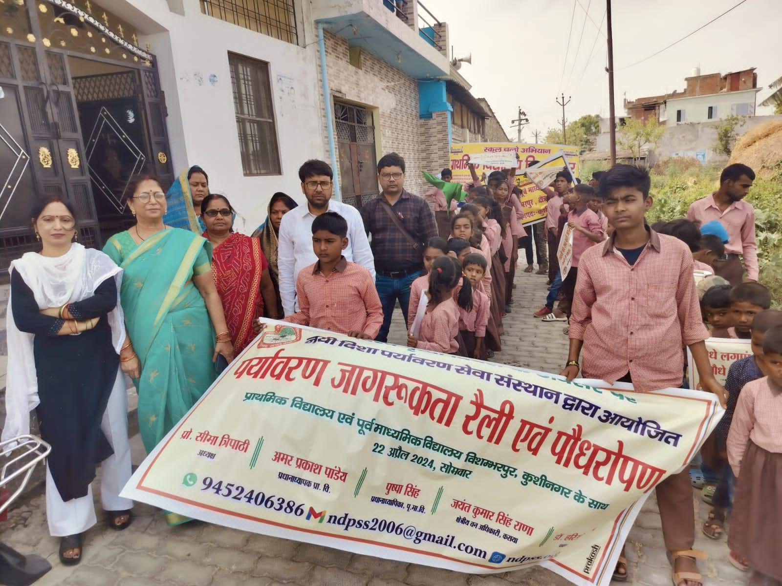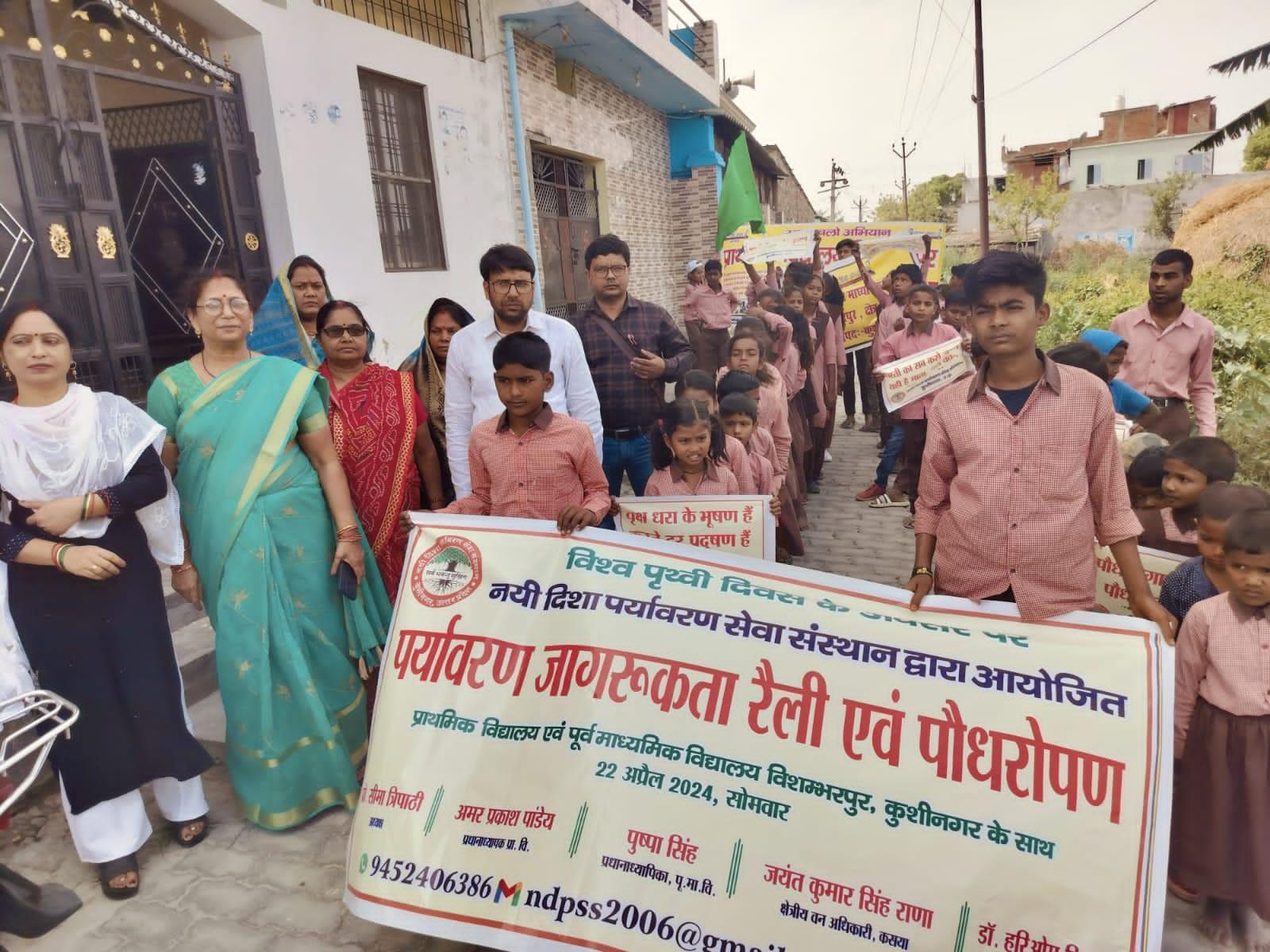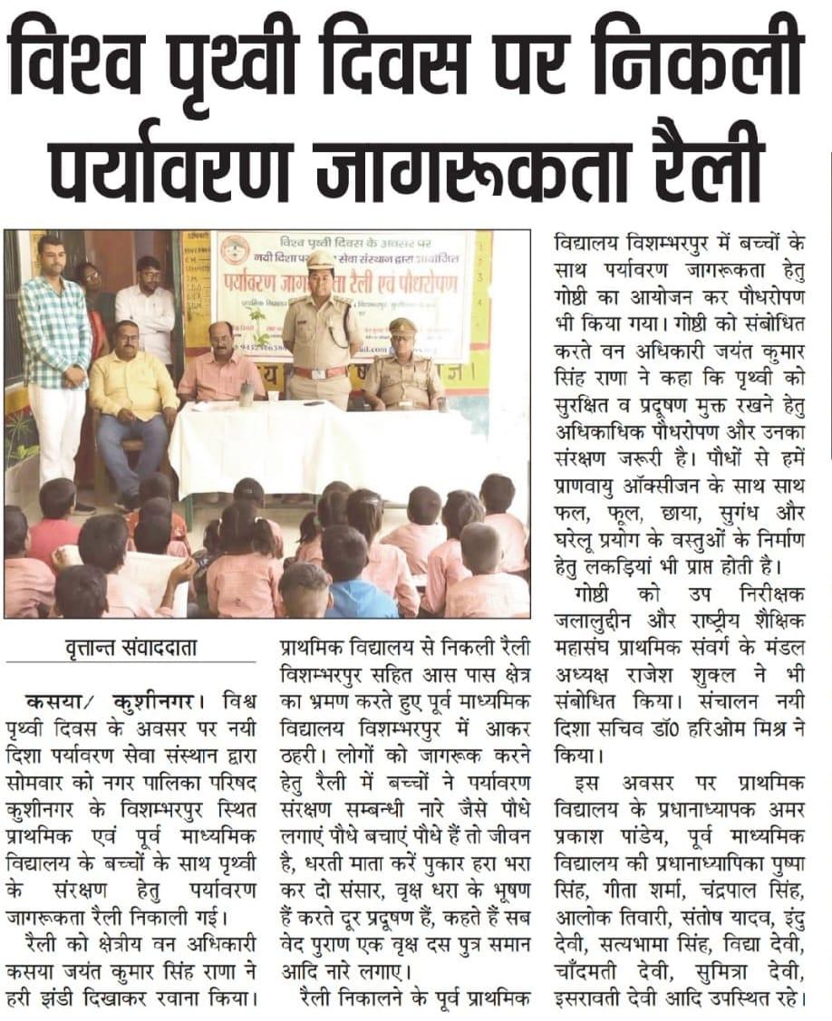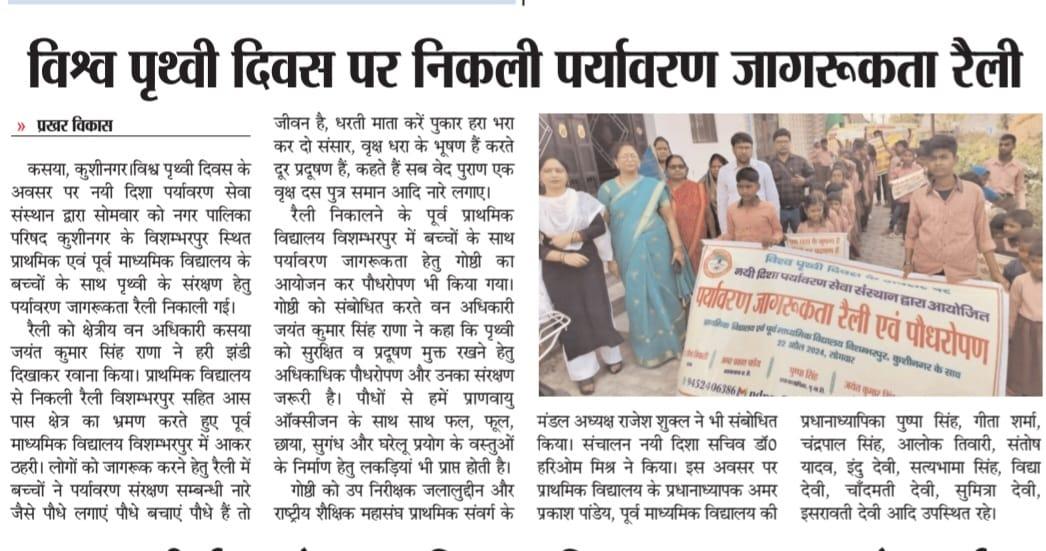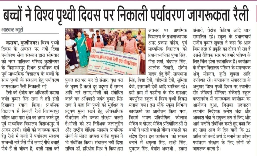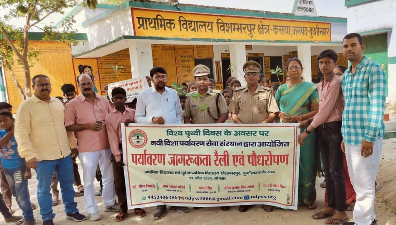 विश्व पृथ्वी दिवस के अवसर पर संस्थान द्वारा नगर पालिका परिषद कुशीनगर के विशम्भरपुर स्थित प्राथमिक एवं पूर्व माध्यमिक विद्यालय के बच्चों के साथ पृथ्वी के संरक्षण हेतु पर्यावरण जागरूकता रैली निकाली गई। रैली को क्षेत्रीय वन अधिकारी कसया श्री जयंत कुमार सिंह राणा ने हरी झंडी दिखाकर रवाना किया। प्राथमिक विद्यालय से निकली रैली विशम्भरपुर सहित आस पास क्षेत्र का भ्रमण करते हुए पूर्व माध्यमिक विद्यालय विशम्भरपुर में आकर ठहरी। लोगों को जागरूक करने हेतु रैली में बच्चों ने पर्यावरण संरक्षण सम्बन्धी नारे जैसे पौधे लगाएं पौधे बचाएं पौधे हैं तो जीवन है, धरती माता करें पुकार हरा भरा कर दो संसार, वृक्ष धरा के भूषण हैं करते दूर प्रदूषण हैं, कहते हैं सब वेद पुराण एक वृक्ष दस पुत्र समान आदि नारे लगाए।