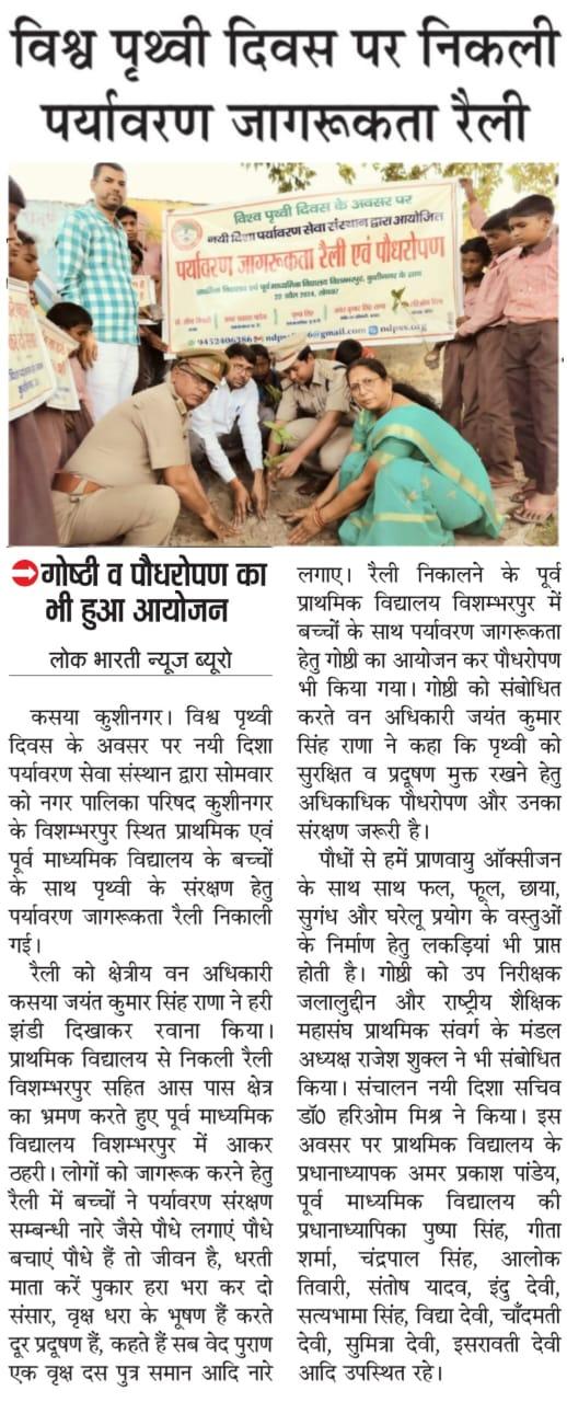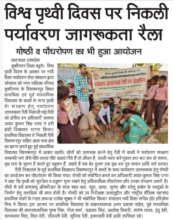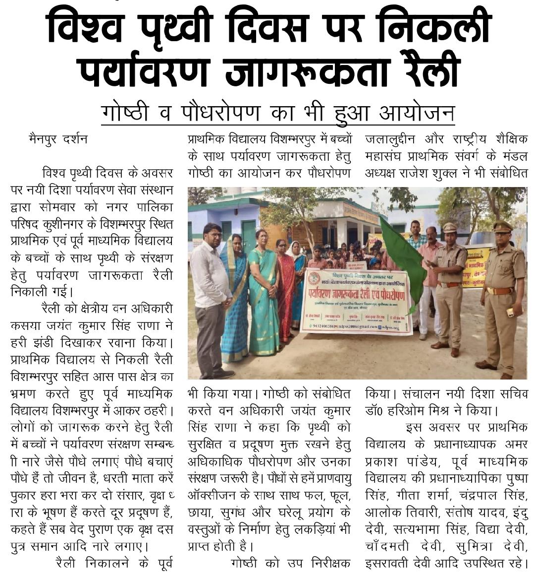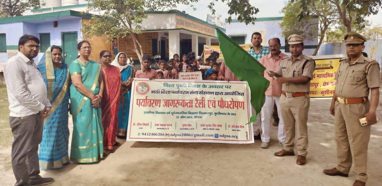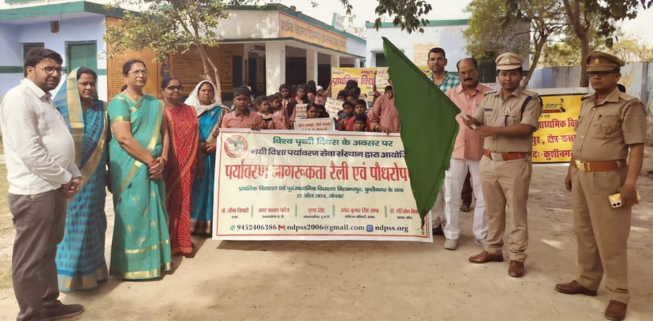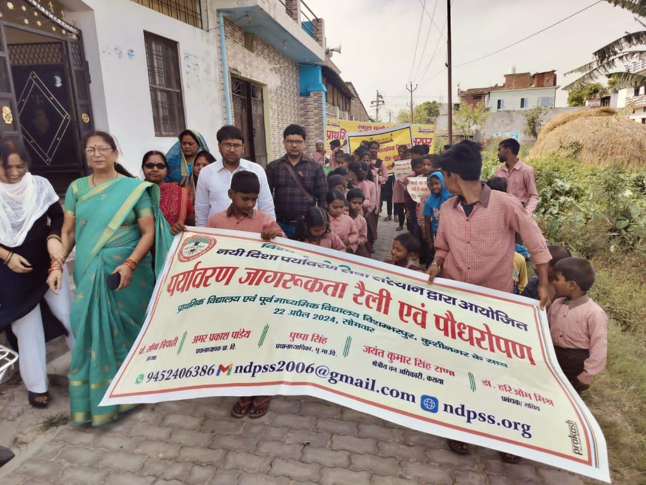विश्व पृथ्वी दिवस के अवसर पर संस्थान द्वारा नगर पालिका परिषद कुशीनगर के विशम्भरपुर स्थित प्राथमिक एवं पूर्व माध्यमिक विद्यालय के बच्चों के साथ पृथ्वी के संरक्षण हेतु पर्यावरण जागरूकता रैली निकाली गई। रैली को क्षेत्रीय वन अधिकारी कसया श्री जयंत कुमार सिंह राणा ने हरी झंडी दिखाकर रवाना किया। प्राथमिक विद्यालय से निकली रैली विशम्भरपुर सहित आस पास क्षेत्र का भ्रमण करते हुए पूर्व माध्यमिक विद्यालय विशम्भरपुर में आकर ठहरी। लोगों को जागरूक करने हेतु रैली में बच्चों ने पर्यावरण संरक्षण सम्बन्धी नारे जैसे पौधे लगाएं पौधे बचाएं पौधे हैं तो जीवन है, धरती माता करें पुकार हरा भरा कर दो संसार, वृक्ष धरा के भूषण हैं करते दूर प्रदूषण हैं, कहते हैं सब वेद पुराण एक वृक्ष दस पुत्र समान आदि नारे लगाए।