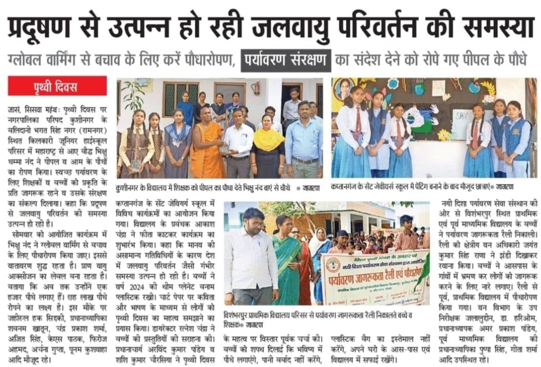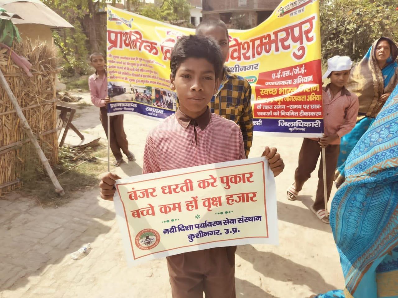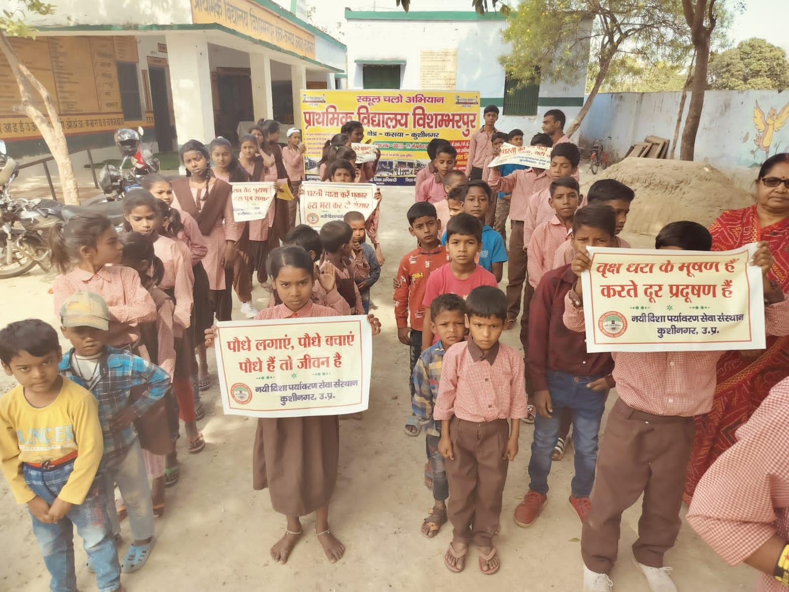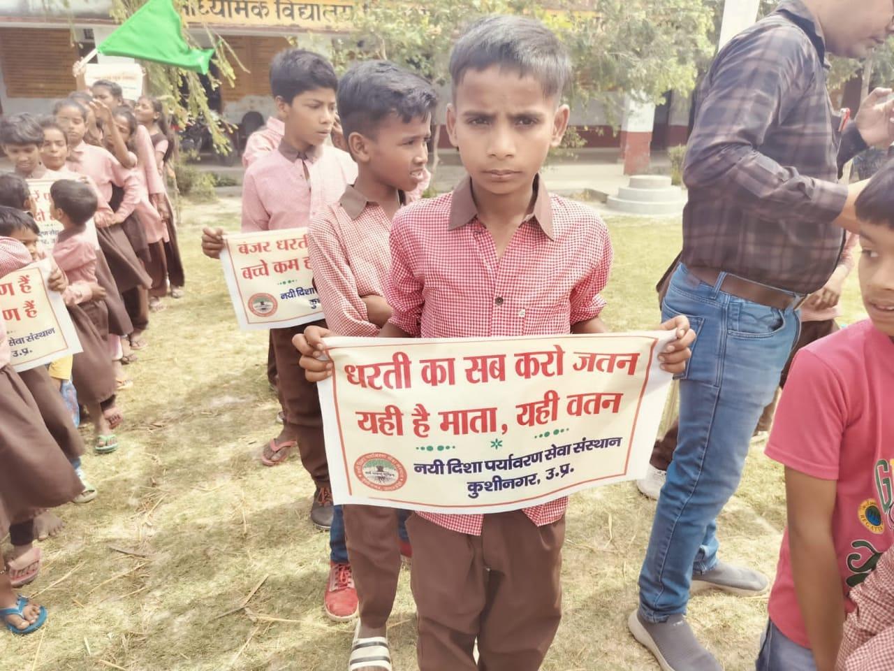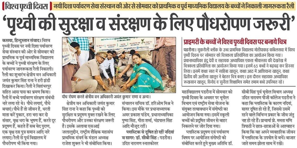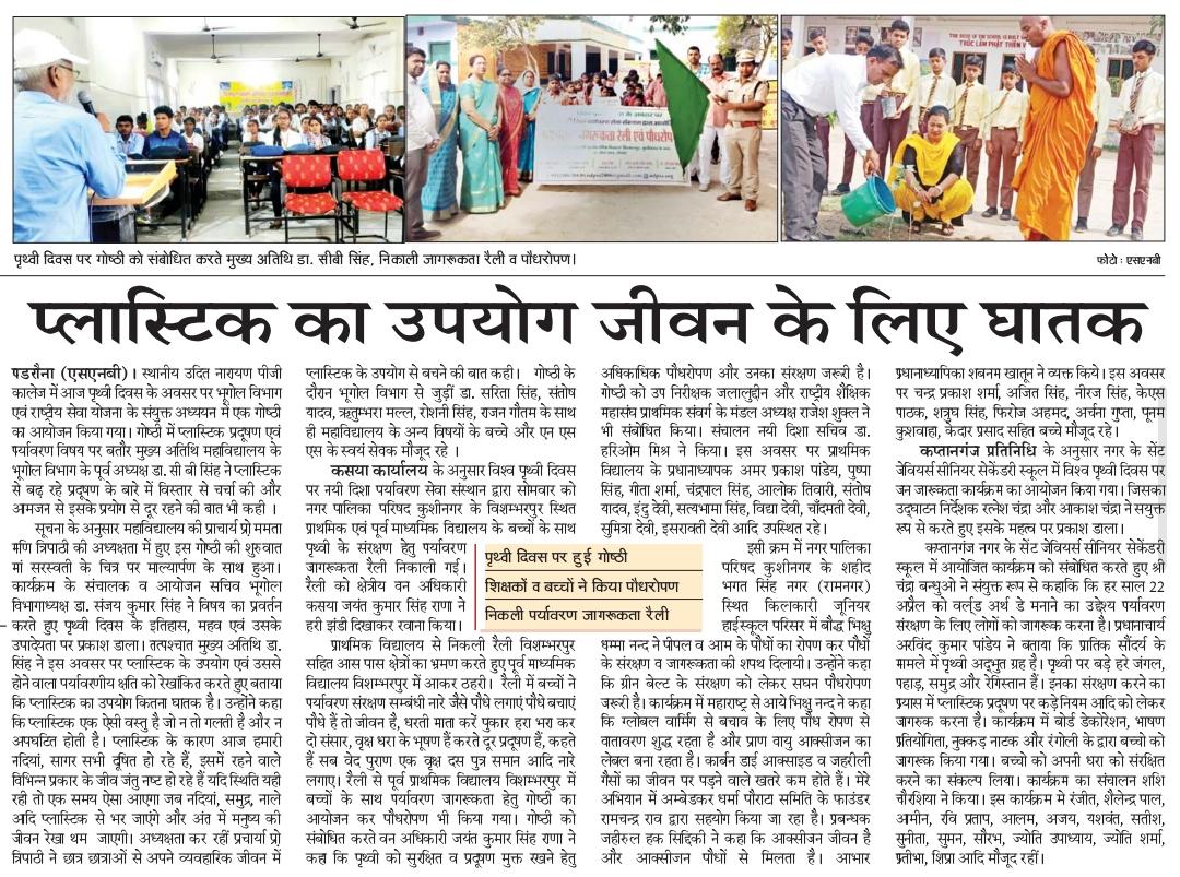 विश्व पृथ्वी दिवस के अवसर पर संस्थान द्वारा नगर पालिका परिषद कुशीनगर के विशम्भरपुर स्थित प्राथमिक एवं पूर्व माध्यमिक विद्यालय के बच्चों के साथ पृथ्वी के संरक्षण हेतु पर्यावरण जागरूकता रैली निकाली गई। रैली को क्षेत्रीय वन अधिकारी कसया श्री जयंत कुमार सिंह राणा ने हरी झंडी दिखाकर रवाना किया। प्राथमिक विद्यालय से निकली रैली विशम्भरपुर सहित आस पास क्षेत्र का भ्रमण करते हुए पूर्व माध्यमिक विद्यालय विशम्भरपुर में आकर ठहरी। लोगों को जागरूक करने हेतु रैली में बच्चों ने पर्यावरण संरक्षण सम्बन्धी नारे जैसे पौधे लगाएं पौधे बचाएं पौधे हैं तो जीवन है, धरती माता करें पुकार हरा भरा कर दो संसार, वृक्ष धरा के भूषण हैं करते दूर प्रदूषण हैं, कहते हैं सब वेद पुराण एक वृक्ष दस पुत्र समान आदि नारे लगाए।