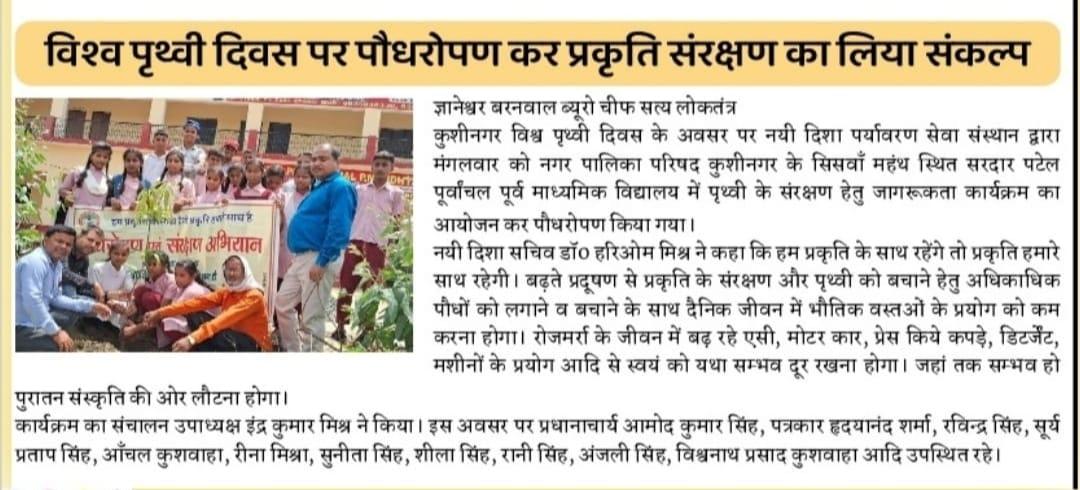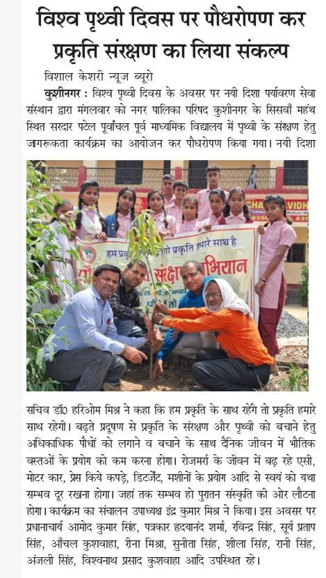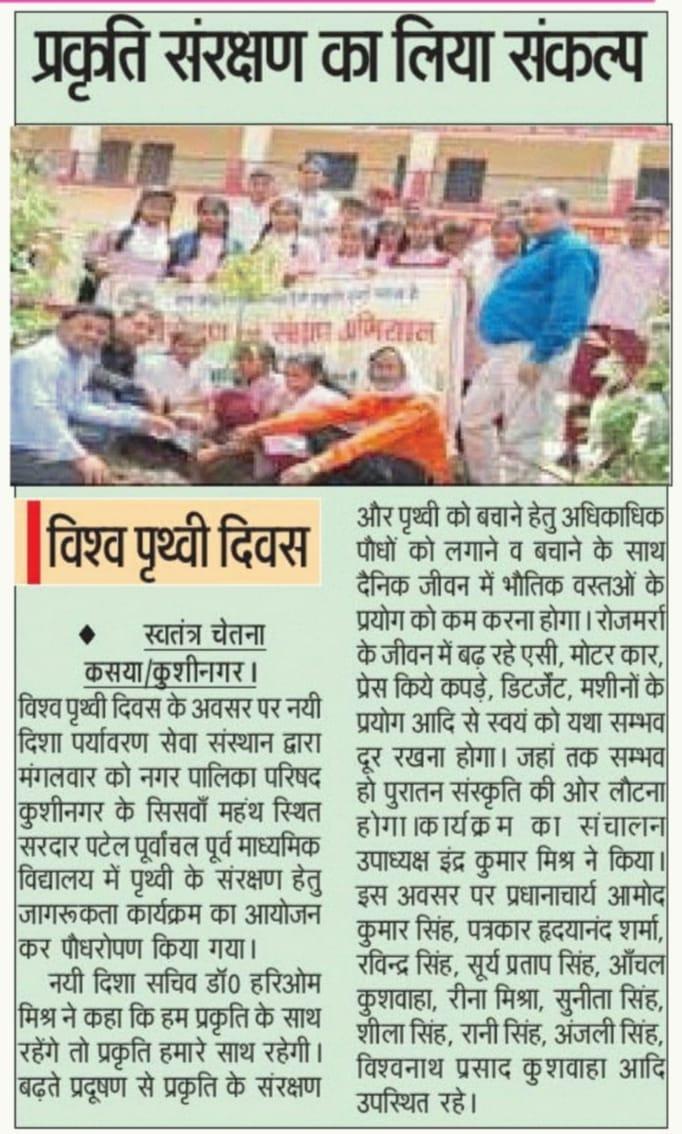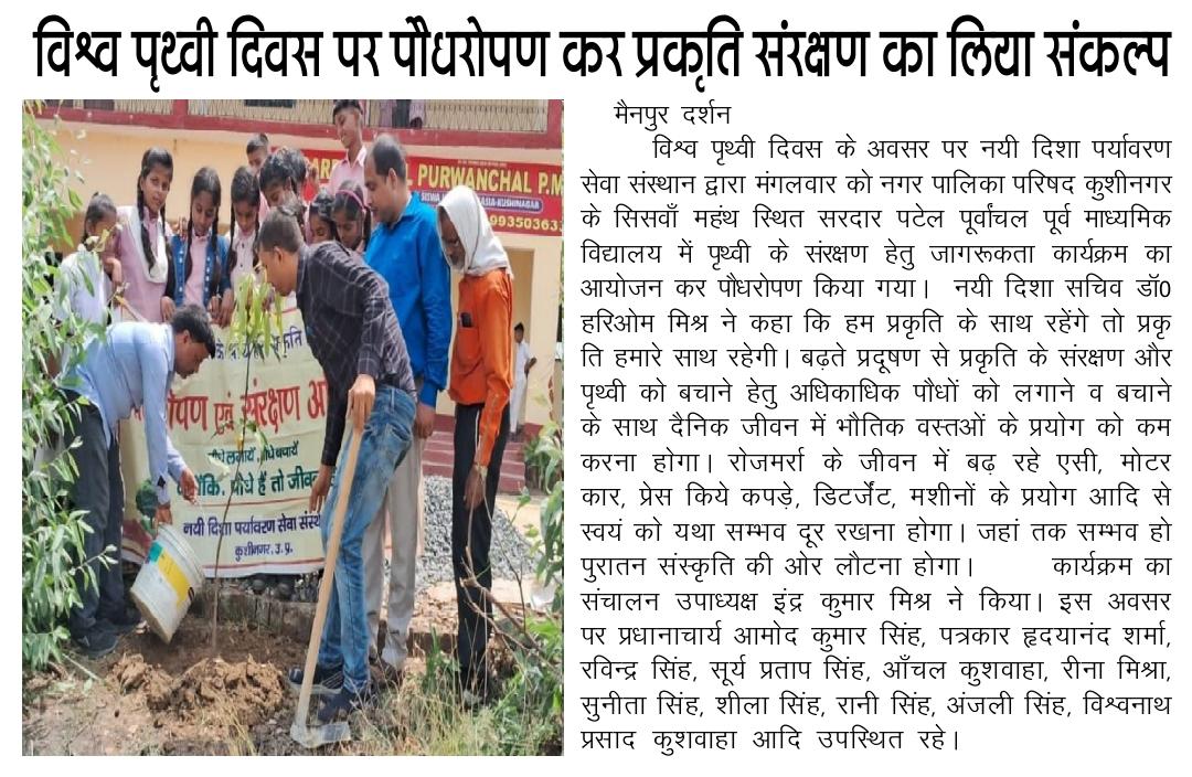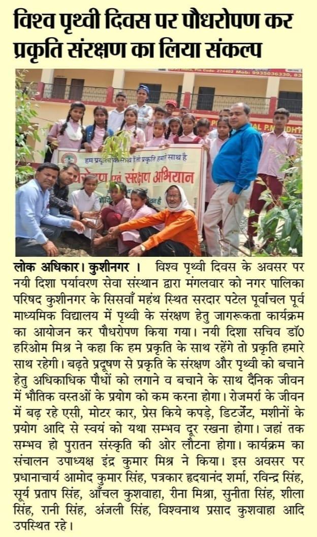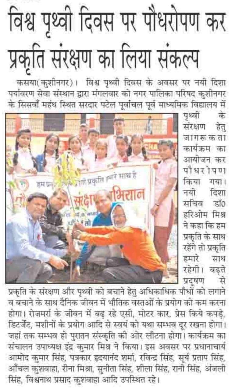 विश्व पृथ्वी दिवस के अवसर पर संस्थान द्वारा नगर पालिका परिषद कुशीनगर के सिसवाँ महंथ स्थित सरदार पटेल पूर्वांचल पूर्व माध्यमिक विद्यालय में पृथ्वी के संरक्षण हेतु जागरूकता कार्यक्रम का आयोजन कर पौधरोपण किया गया। इस अवसर पर प्रधानाचार्य श्री आमोद कुमार सिंह, पत्रकार श्री हृदयानंद शर्मा, श्री रविन्द्र सिंह, श्री सूर्य प्रताप सिंह, आँचल कुशवाहा जी, रीना मिश्रा जी, सुनीता सिंह जी, शीला सिंह जी, रानी सिंह जी, अंजली सिंह जी, श्री विश्वनाथ प्रसाद कुशवाहा, नयी दिशा उपाध्यक्ष श्री इंद्र कुमार मिश्र, सचिव डॉ0 हरिओम मिश्र आदि उपस्थित रहे