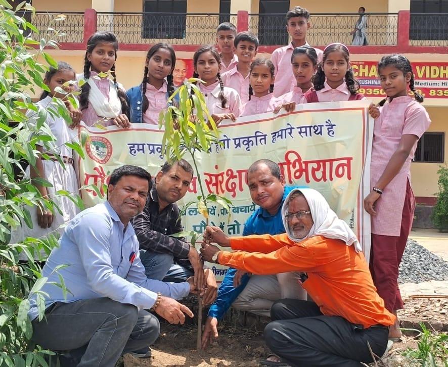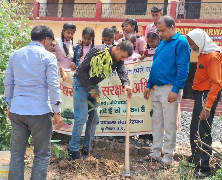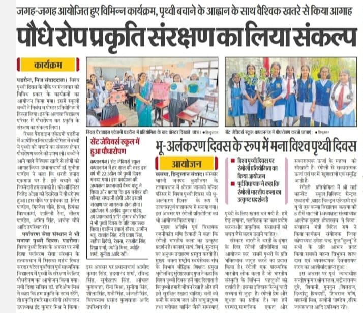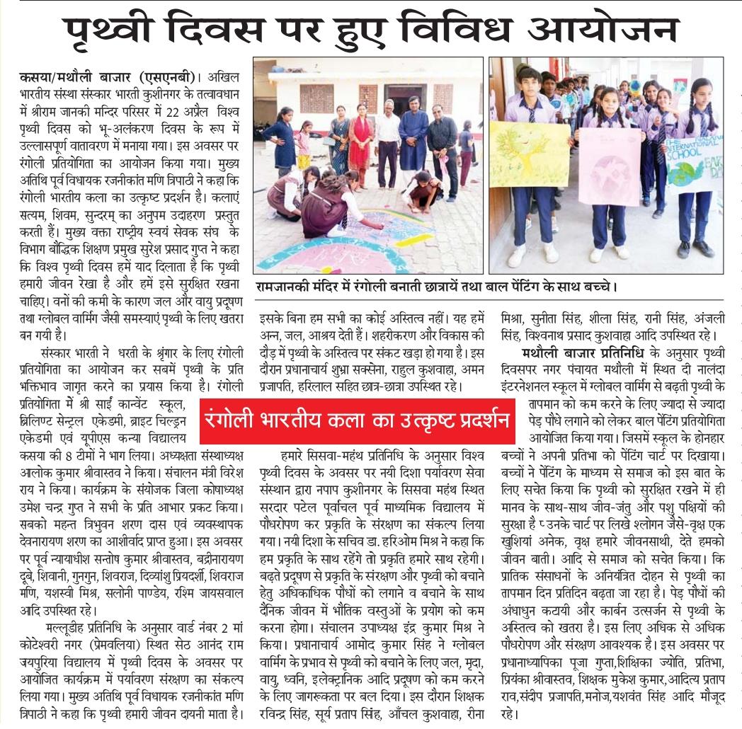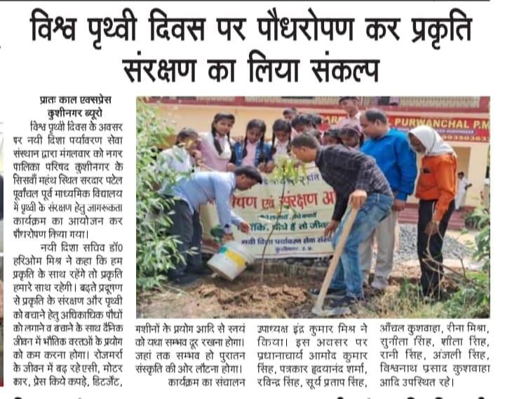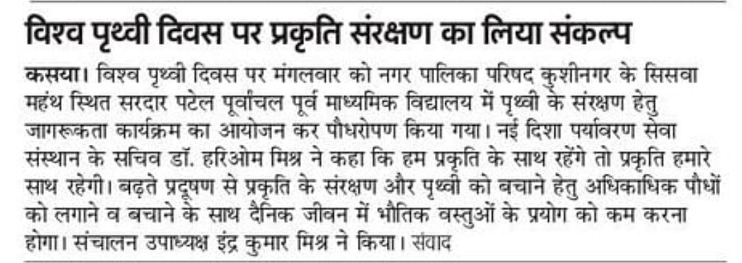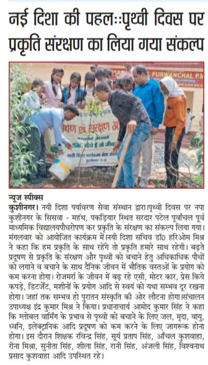 विश्व पृथ्वी दिवस के अवसर पर संस्थान द्वारा नगर पालिका परिषद कुशीनगर के सिसवाँ महंथ स्थित सरदार पटेल पूर्वांचल पूर्व माध्यमिक विद्यालय में पृथ्वी के संरक्षण हेतु जागरूकता कार्यक्रम का आयोजन कर पौधरोपण किया गया। इस अवसर पर प्रधानाचार्य श्री आमोद कुमार सिंह, पत्रकार श्री हृदयानंद शर्मा, श्री रविन्द्र सिंह, श्री सूर्य प्रताप सिंह, आँचल कुशवाहा जी, रीना मिश्रा जी, सुनीता सिंह जी, शीला सिंह जी, रानी सिंह जी, अंजली सिंह जी, श्री विश्वनाथ प्रसाद कुशवाहा, नयी दिशा उपाध्यक्ष श्री इंद्र कुमार मिश्र, सचिव डॉ0 हरिओम मिश्र आदि उपस्थित रहे