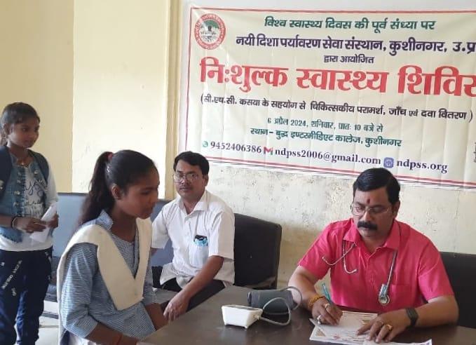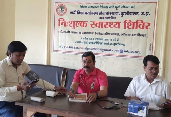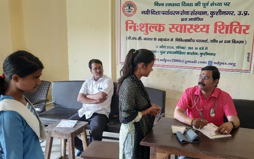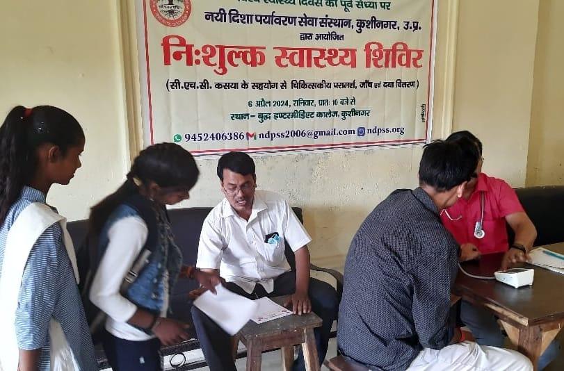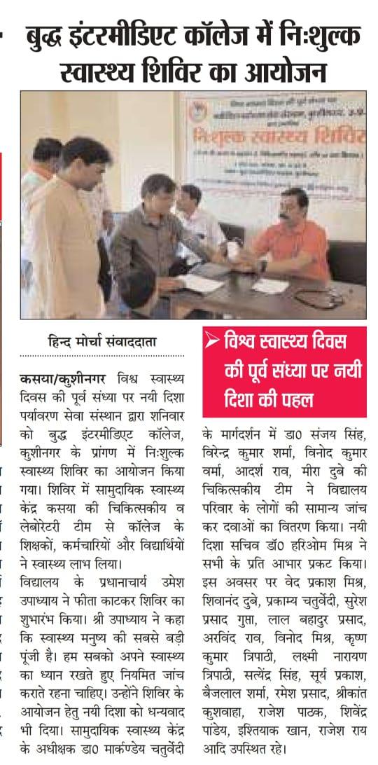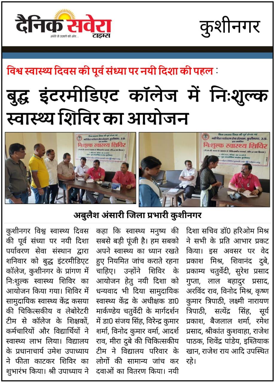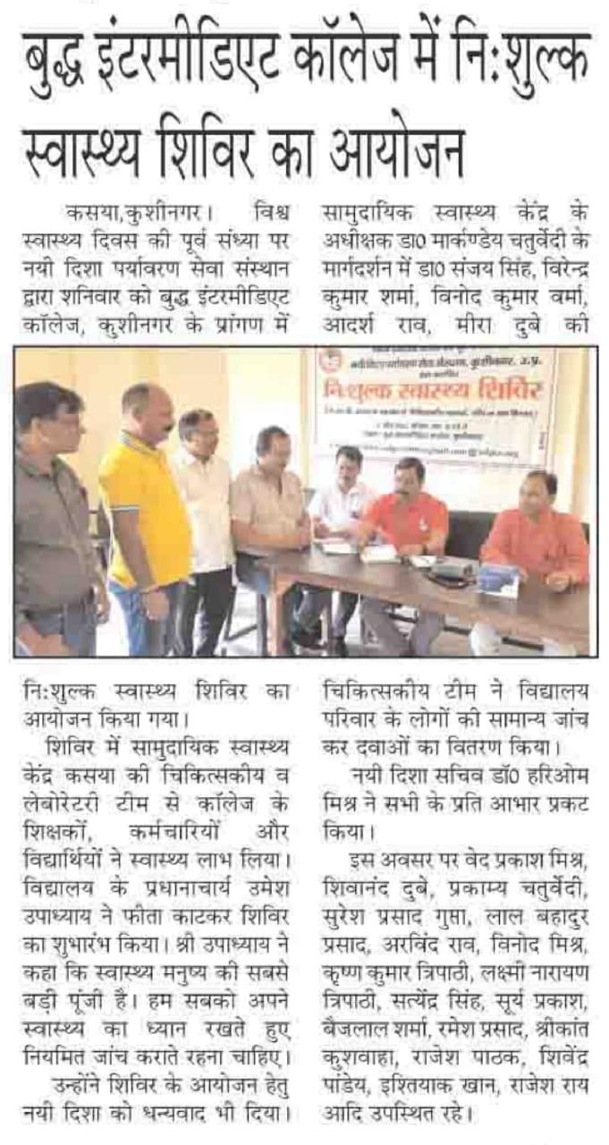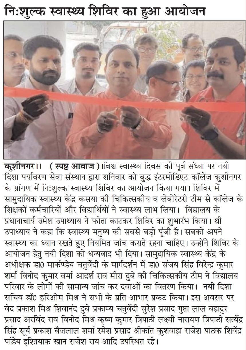 विश्व स्वास्थ्य दिवस की पूर्व संध्या पर नयी दिशा पर्यावरण सेवा संस्थान द्वारा बुद्ध इंटरमीडिएट कॉलेज, कुशीनगर के प्रांगण में निःशुल्क स्वास्थ्य शिविर का आयोजन किया गया। शिविर में सामुदायिक स्वास्थ्य केंद्र कसया की चिकित्सकीय व लेबोरेटरी टीम से कॉलेज के शिक्षकों, कर्मचारियों और विद्यार्थियों ने स्वास्थ्य लाभ लिया।