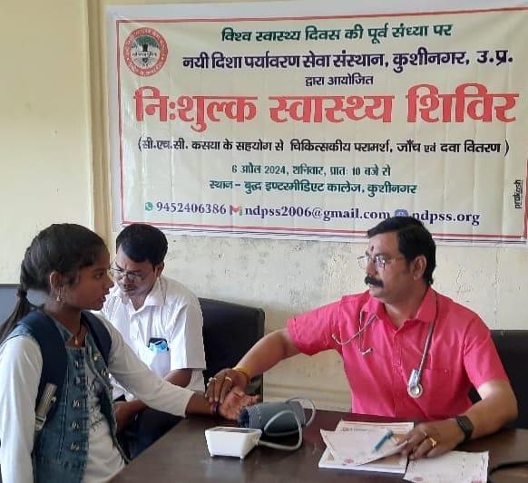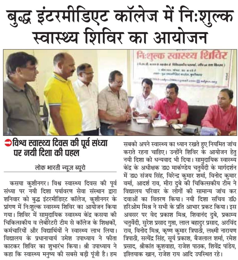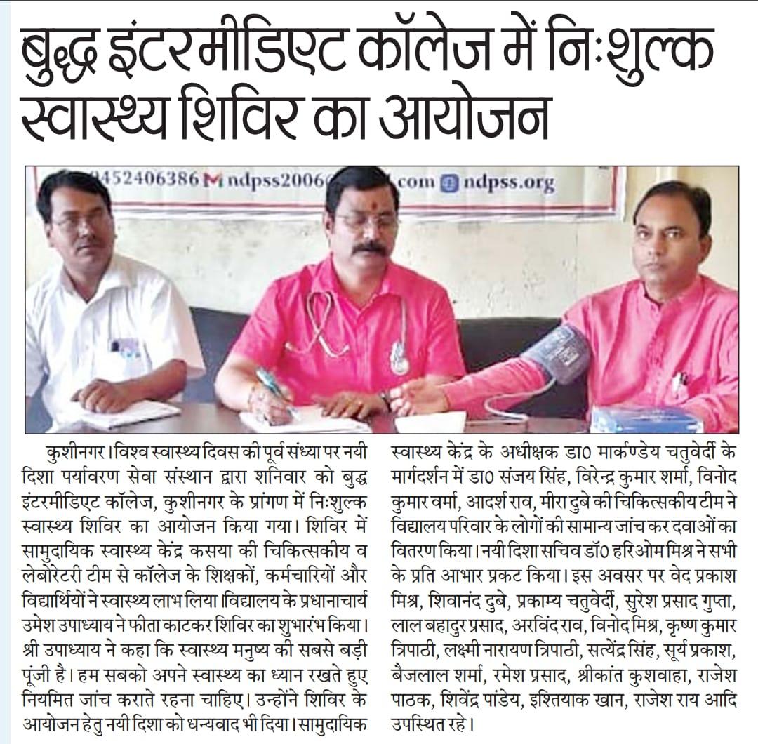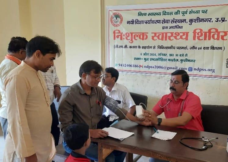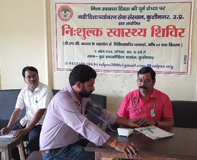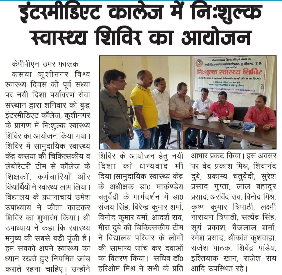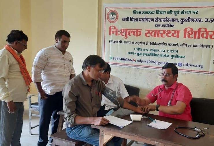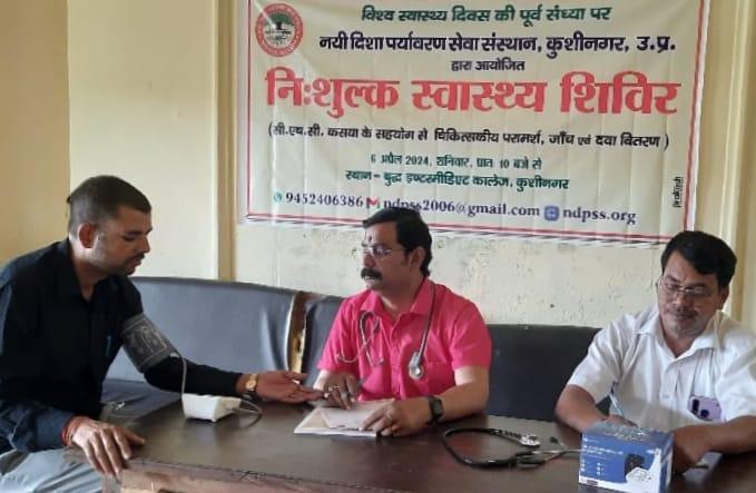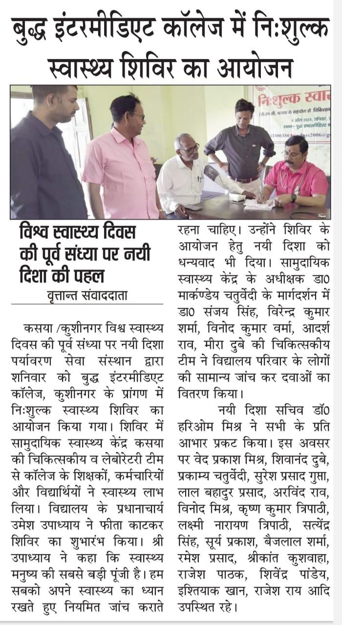 विश्व स्वास्थ्य दिवस की पूर्व संध्या पर नयी दिशा पर्यावरण सेवा संस्थान द्वारा बुद्ध इंटरमीडिएट कॉलेज, कुशीनगर के प्रांगण में निःशुल्क स्वास्थ्य शिविर का आयोजन किया गया। शिविर में सामुदायिक स्वास्थ्य केंद्र कसया की चिकित्सकीय व लेबोरेटरी टीम से कॉलेज के शिक्षकों, कर्मचारियों और विद्यार्थियों ने स्वास्थ्य लाभ लिया।