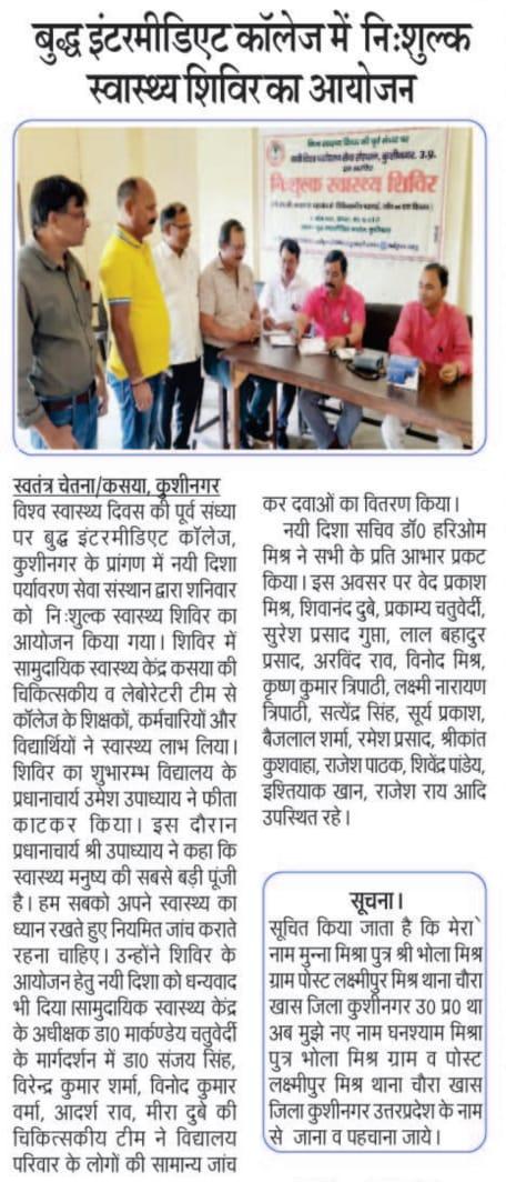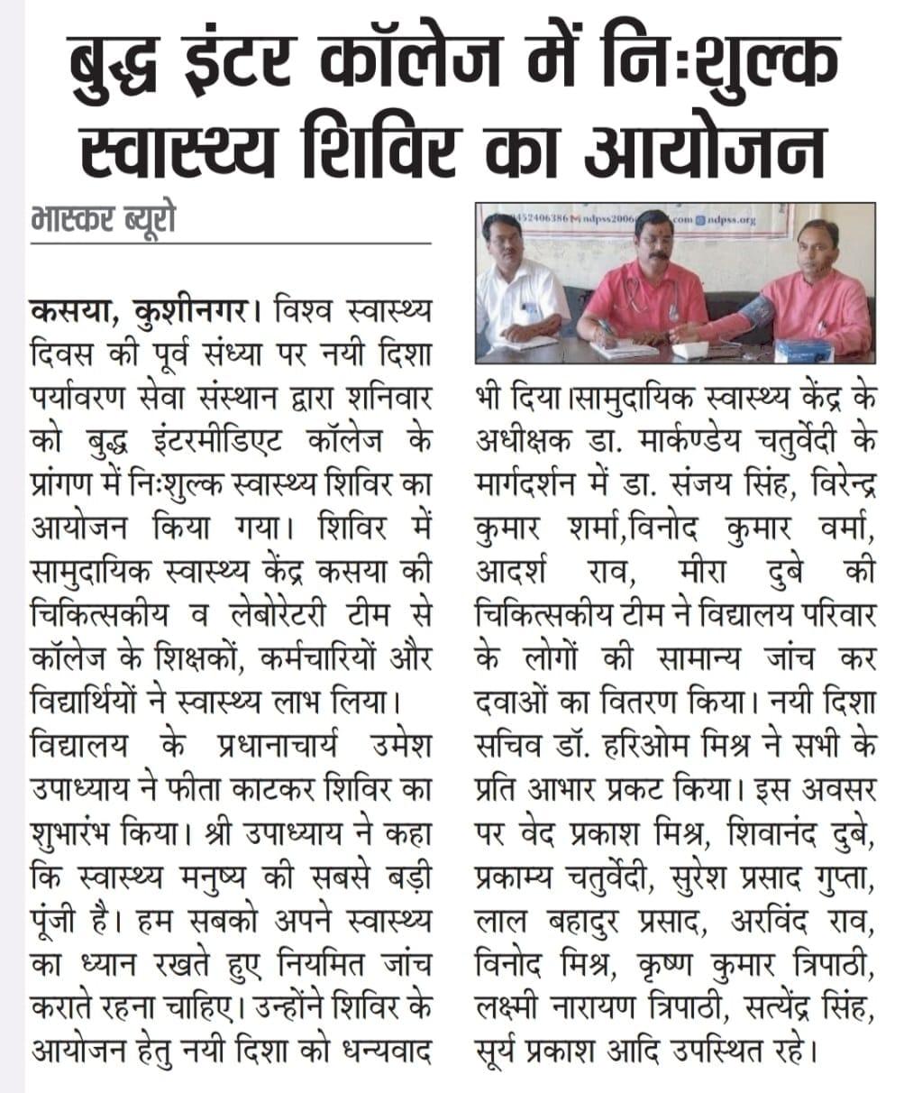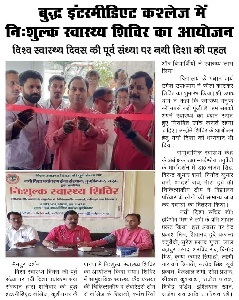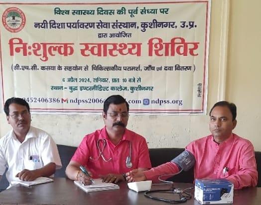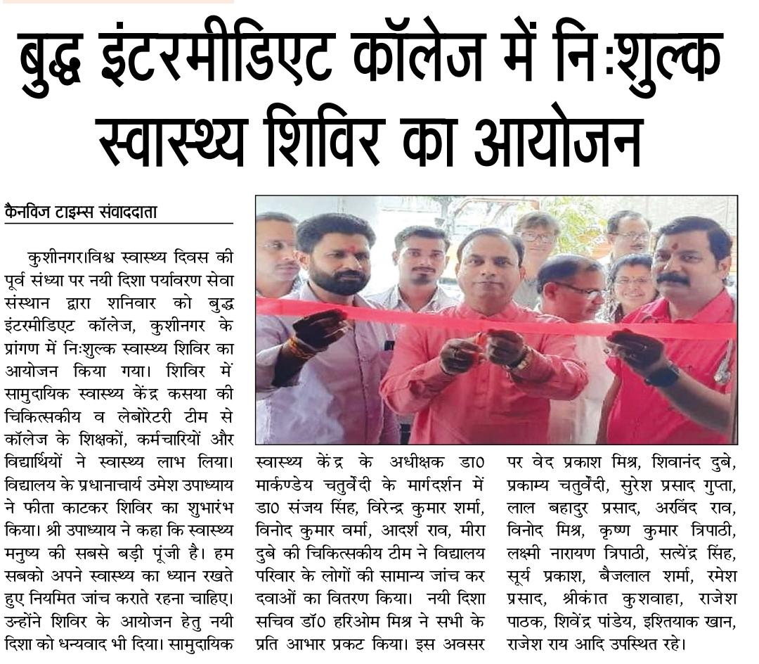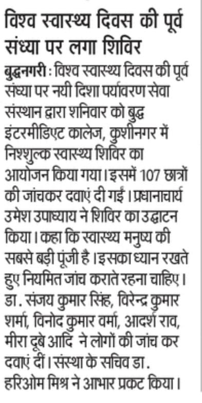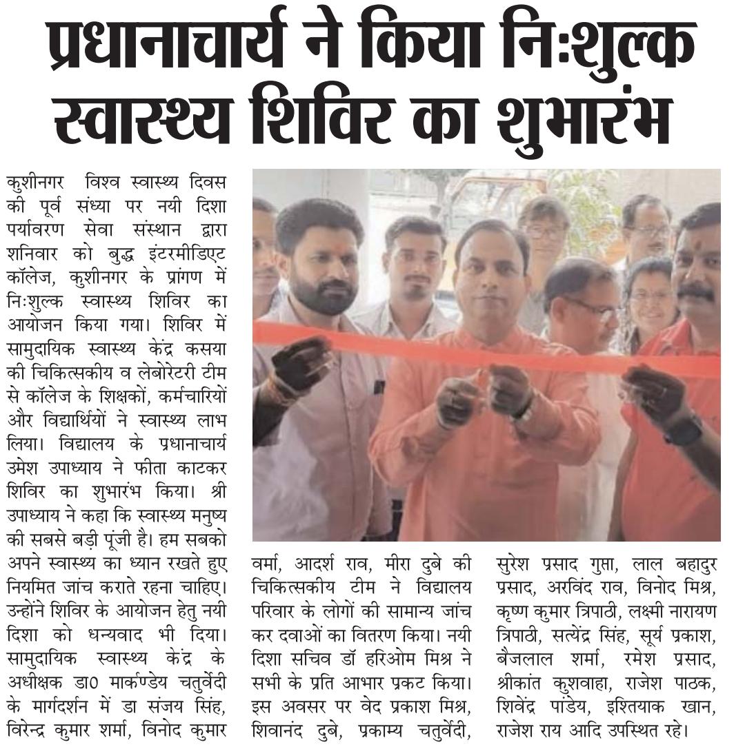 विश्व स्वास्थ्य दिवस की पूर्व संध्या पर नयी दिशा पर्यावरण सेवा संस्थान द्वारा बुद्ध इंटरमीडिएट कॉलेज, कुशीनगर के प्रांगण में निःशुल्क स्वास्थ्य शिविर का आयोजन किया गया। शिविर में सामुदायिक स्वास्थ्य केंद्र कसया की चिकित्सकीय व लेबोरेटरी टीम से कॉलेज के शिक्षकों, कर्मचारियों और विद्यार्थियों ने स्वास्थ्य लाभ लिया।