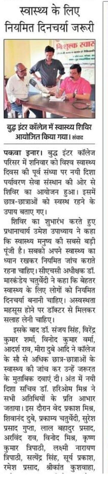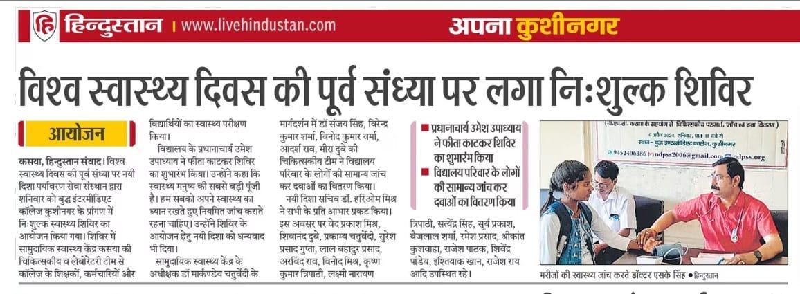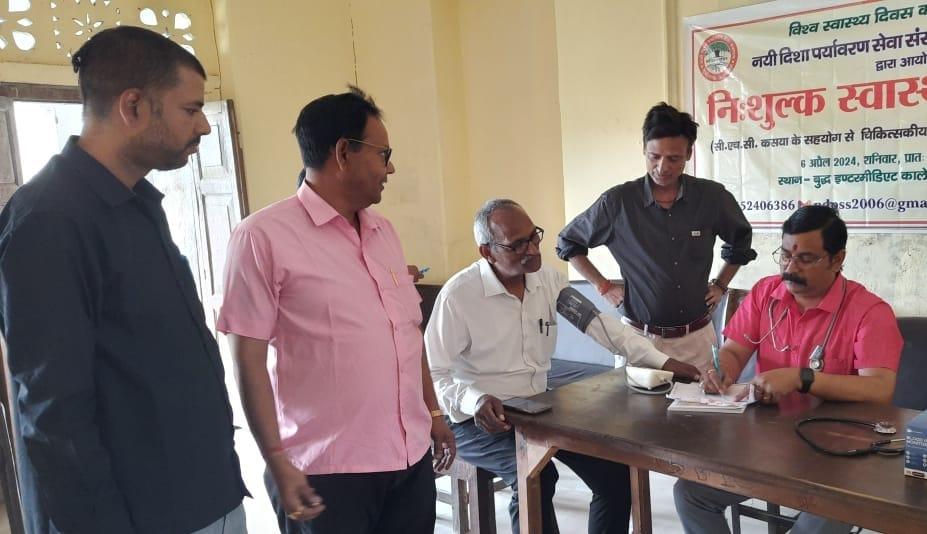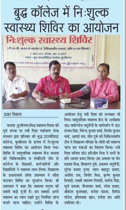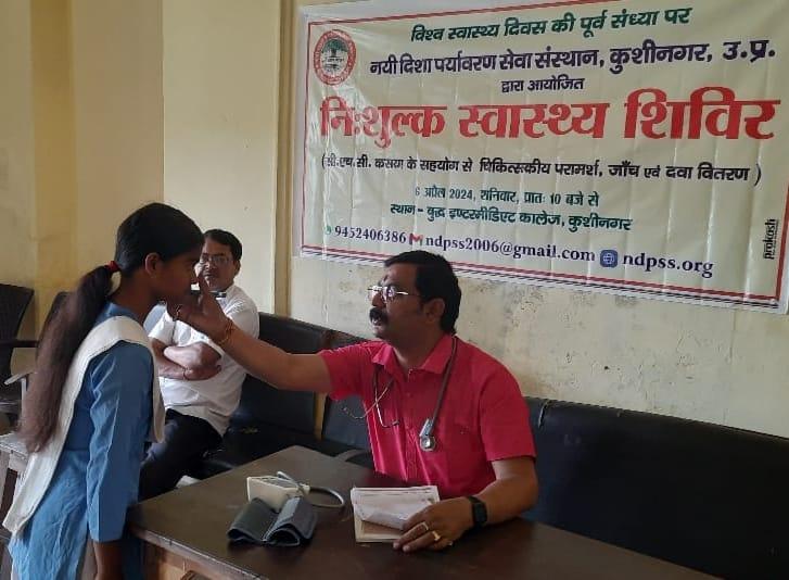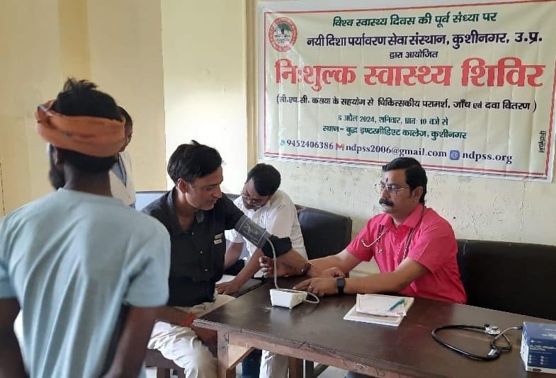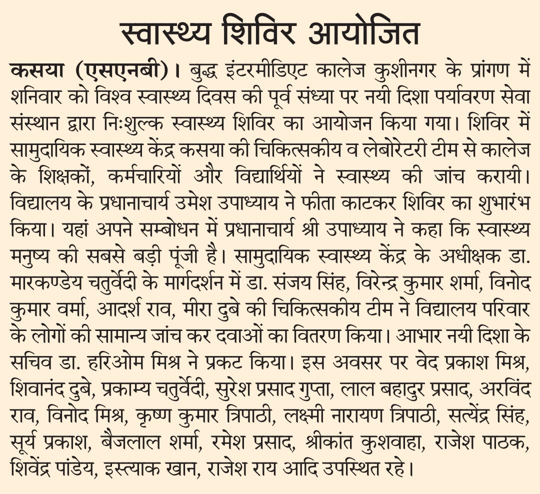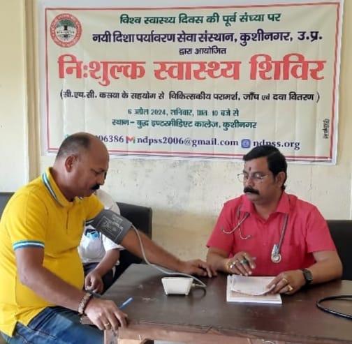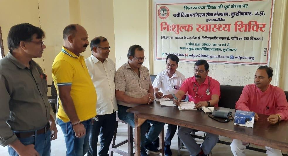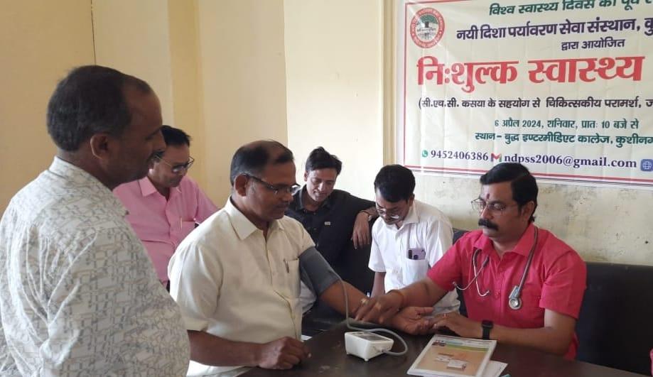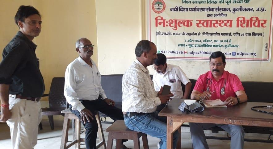 विश्व स्वास्थ्य दिवस की पूर्व संध्या पर नयी दिशा पर्यावरण सेवा संस्थान द्वारा बुद्ध इंटरमीडिएट कॉलेज, कुशीनगर के प्रांगण में निःशुल्क स्वास्थ्य शिविर का आयोजन किया गया। शिविर में सामुदायिक स्वास्थ्य केंद्र कसया की चिकित्सकीय व लेबोरेटरी टीम से कॉलेज के शिक्षकों, कर्मचारियों और विद्यार्थियों ने स्वास्थ्य लाभ लिया।