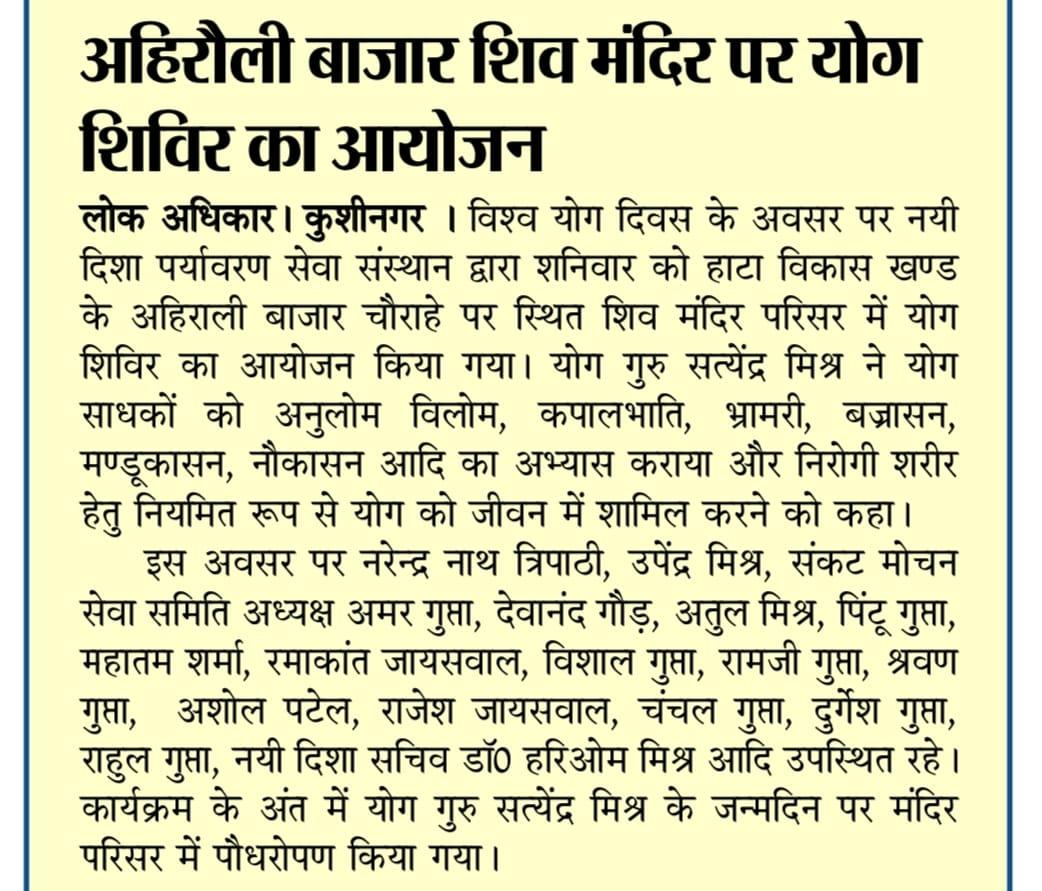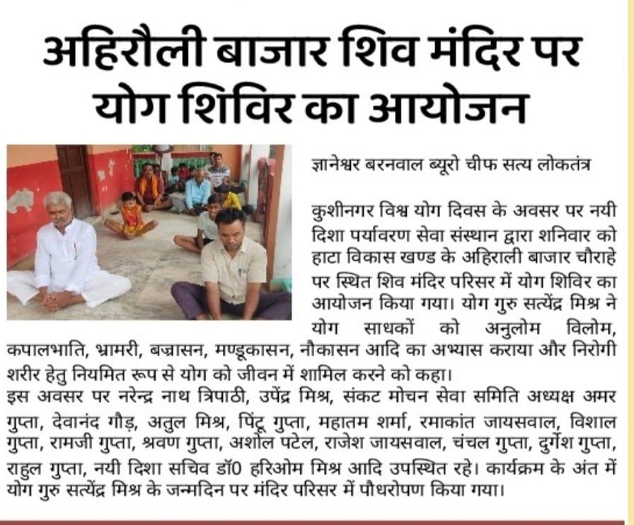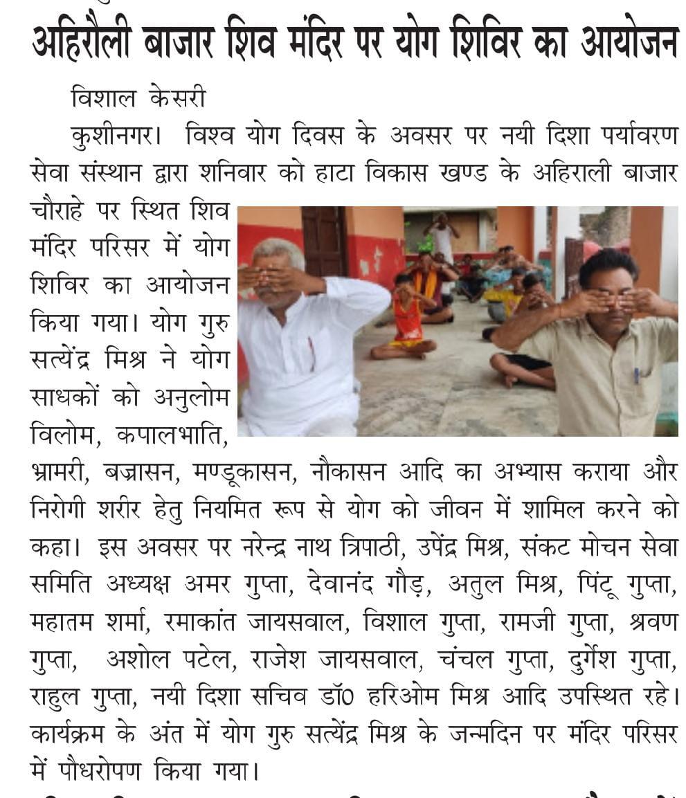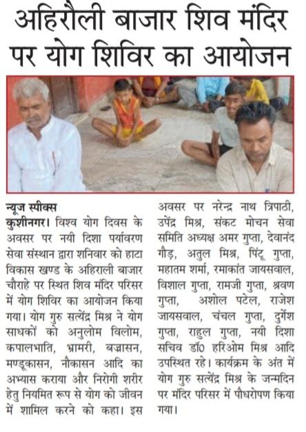 विश्व योग दिवस के अवसर पर संस्थान द्वारा हाटा विकास खण्ड के अहिराली बाजार चौराहे पर स्थित शिव मंदिर परिसर में योग शिविर का आयोजन किया गया। योग गुरु श्री सत्येंद्र मिश्र ने योग साधकों को अनुलोम विलोम, कपालभाति, भ्रामरी, बज्रासन, मण्डूकासन, नौकासन आदि का अभ्यास कराया।