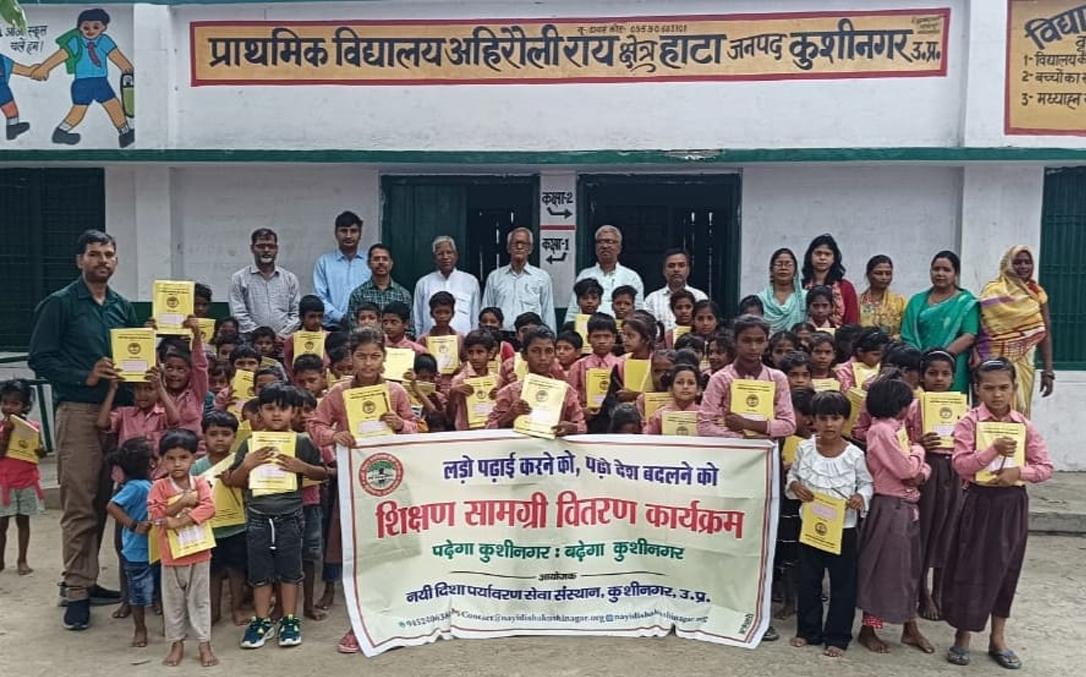 प्राथमिक विद्यालय अहिरौली राय में विद्यार्थियों को जन सहयोग से शिक्षण सामग्री