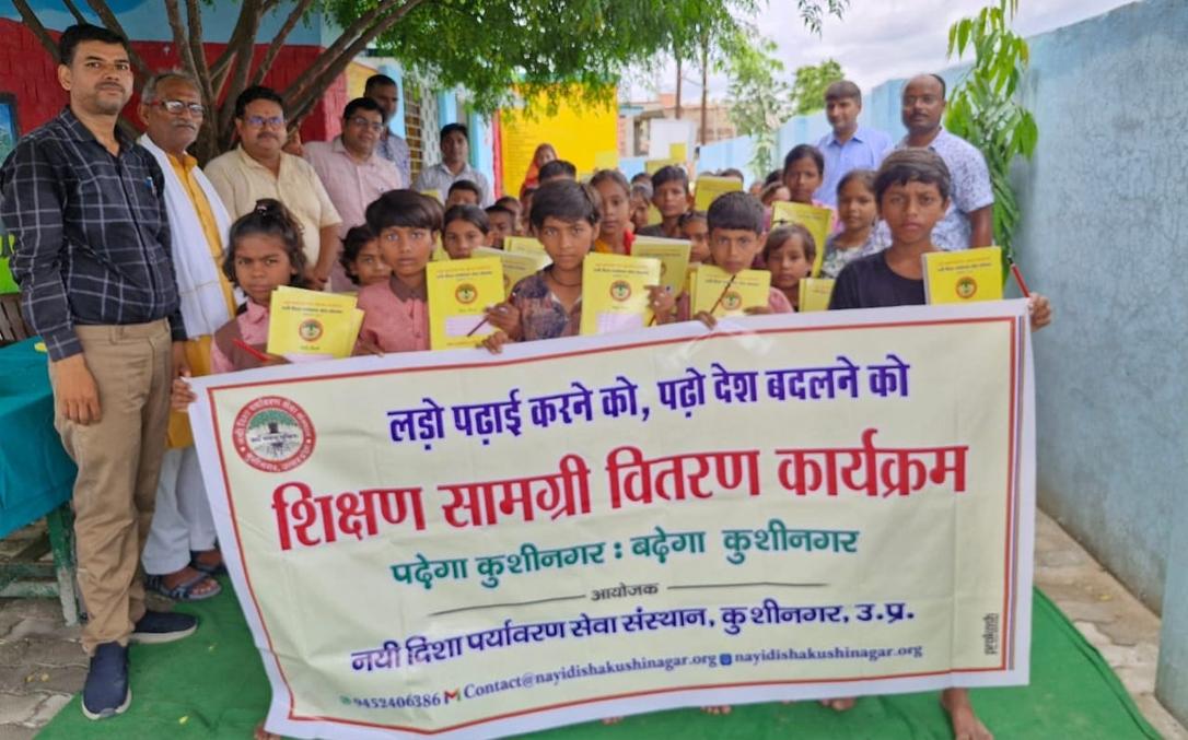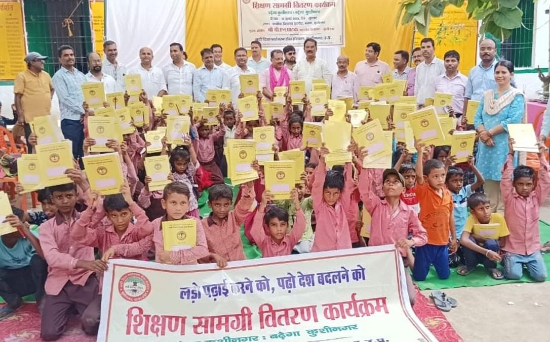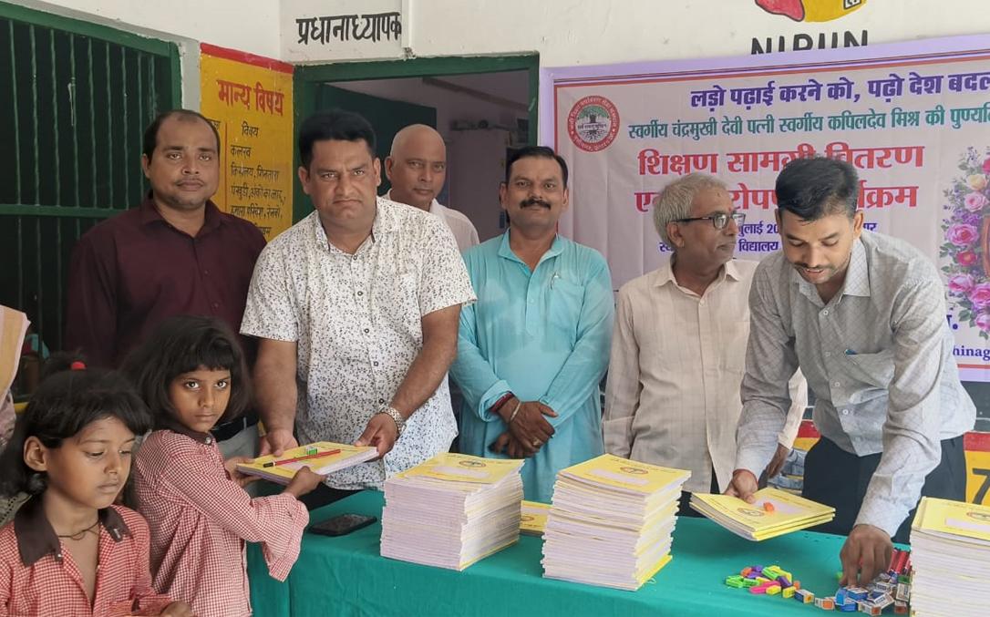 प्राथमिक विद्यालय नरकटिया खुर्द में विद्यार्थियों को जन सहयोग से शिक्षण सामग्री