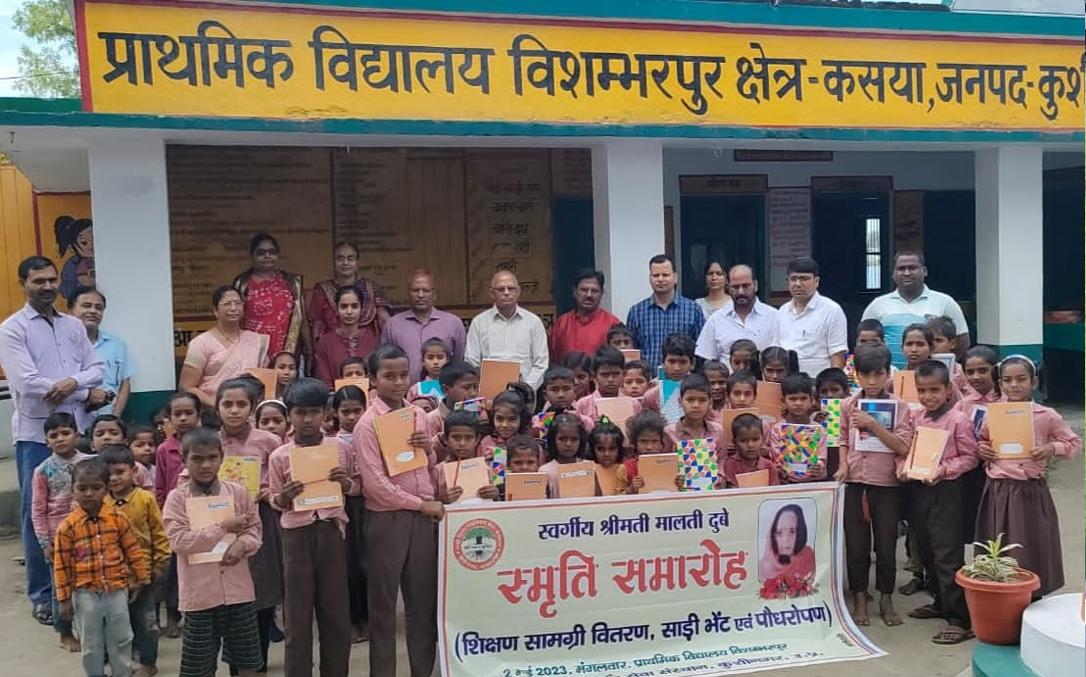 स्व0 श्रीमती मालती दुबे की पुण्यतिथि पर शिक्षण सामग्री व साड़ी भेंट कर पौधरोपण किया गया